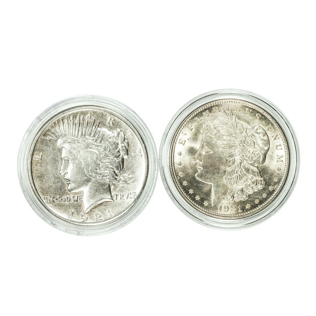 One Lot of 1921 $1 Peace & Morgan Silver Dollar Coins.