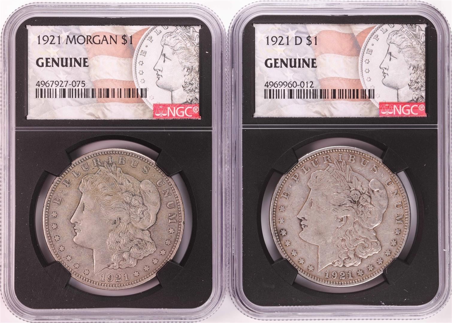 One Lot of 1921 & 1921-D $1 Morgan Silver Dollar Coins NGC Genuine. NGC Certified.
