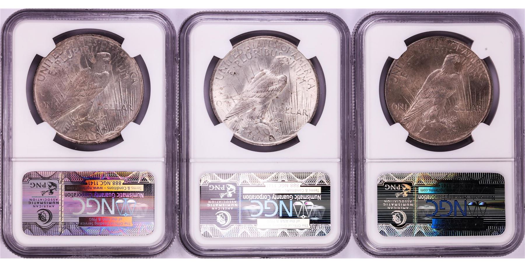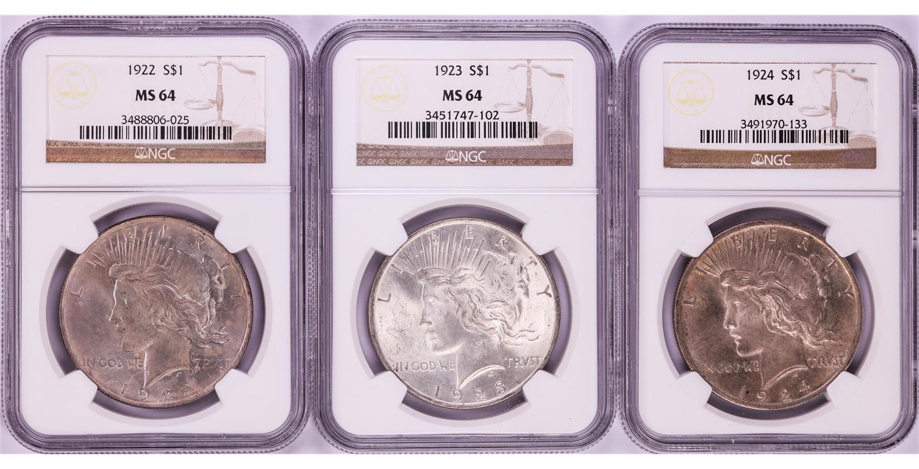 One Lot of 1922-1924 $1 Peace Silver Dollar Coins NGC MS64. NGC Certified.