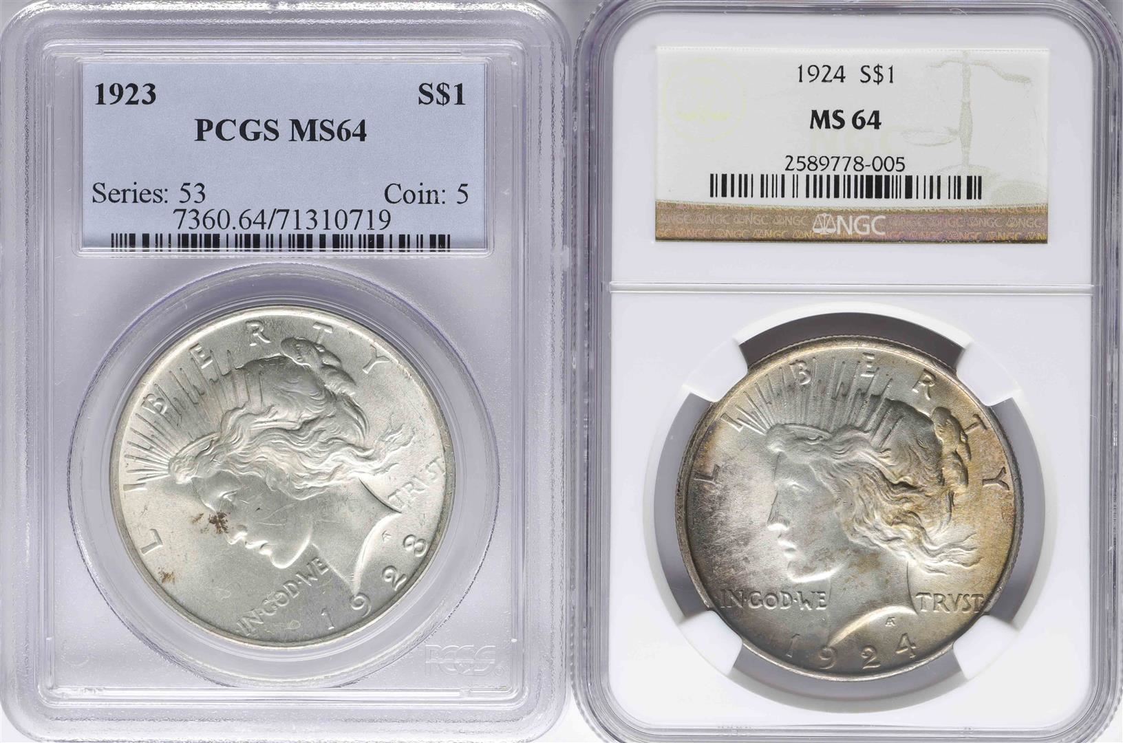One Lot of 1923 & 1924 $1 Peace Silver Dollar Coins PCGS/NGC MS64. NGC Certified.