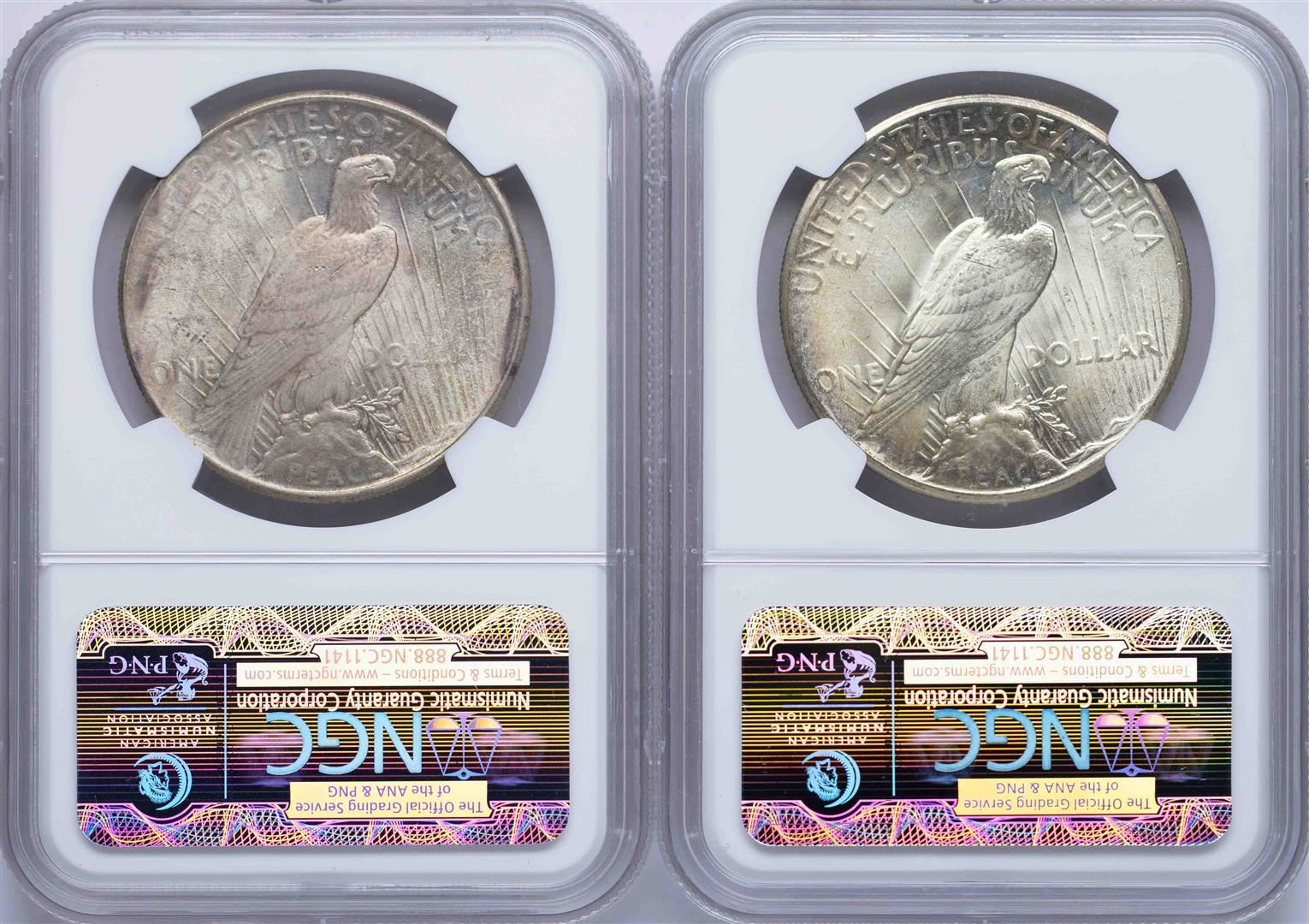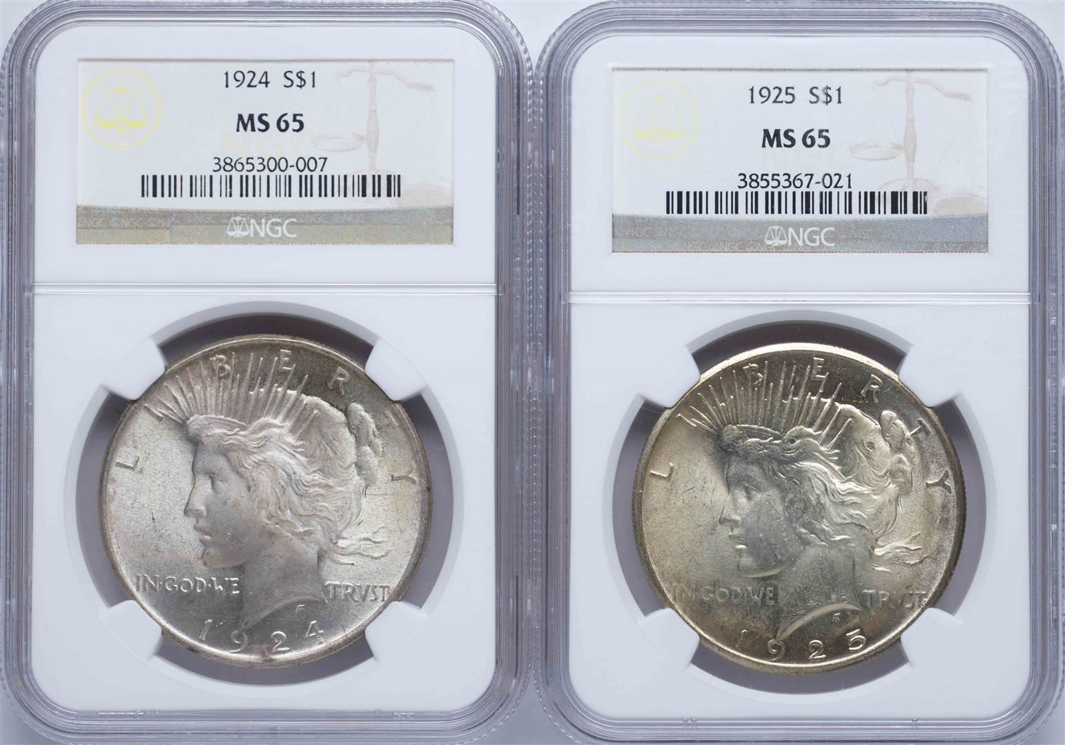 One Lot of 1924-1925 $1 Peace Silver Dollar Coins NGC MS65. NGC Certified.