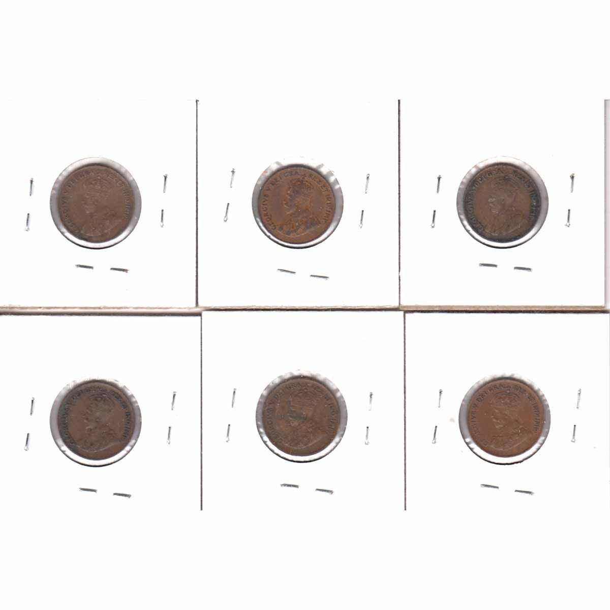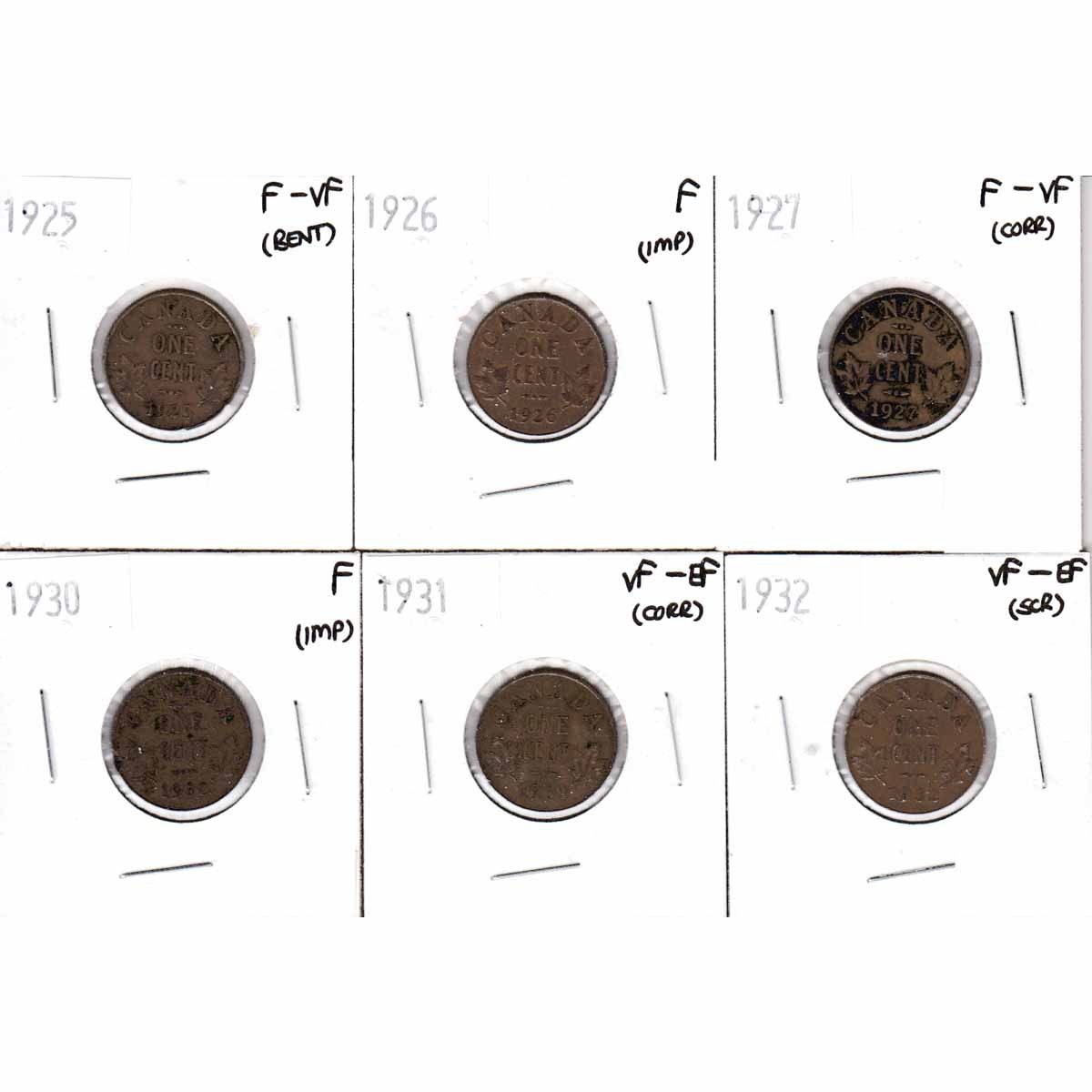 Lot of 1925-1932 Canada 1-cent F to VF-EF (coins have various impairments). 6pcs