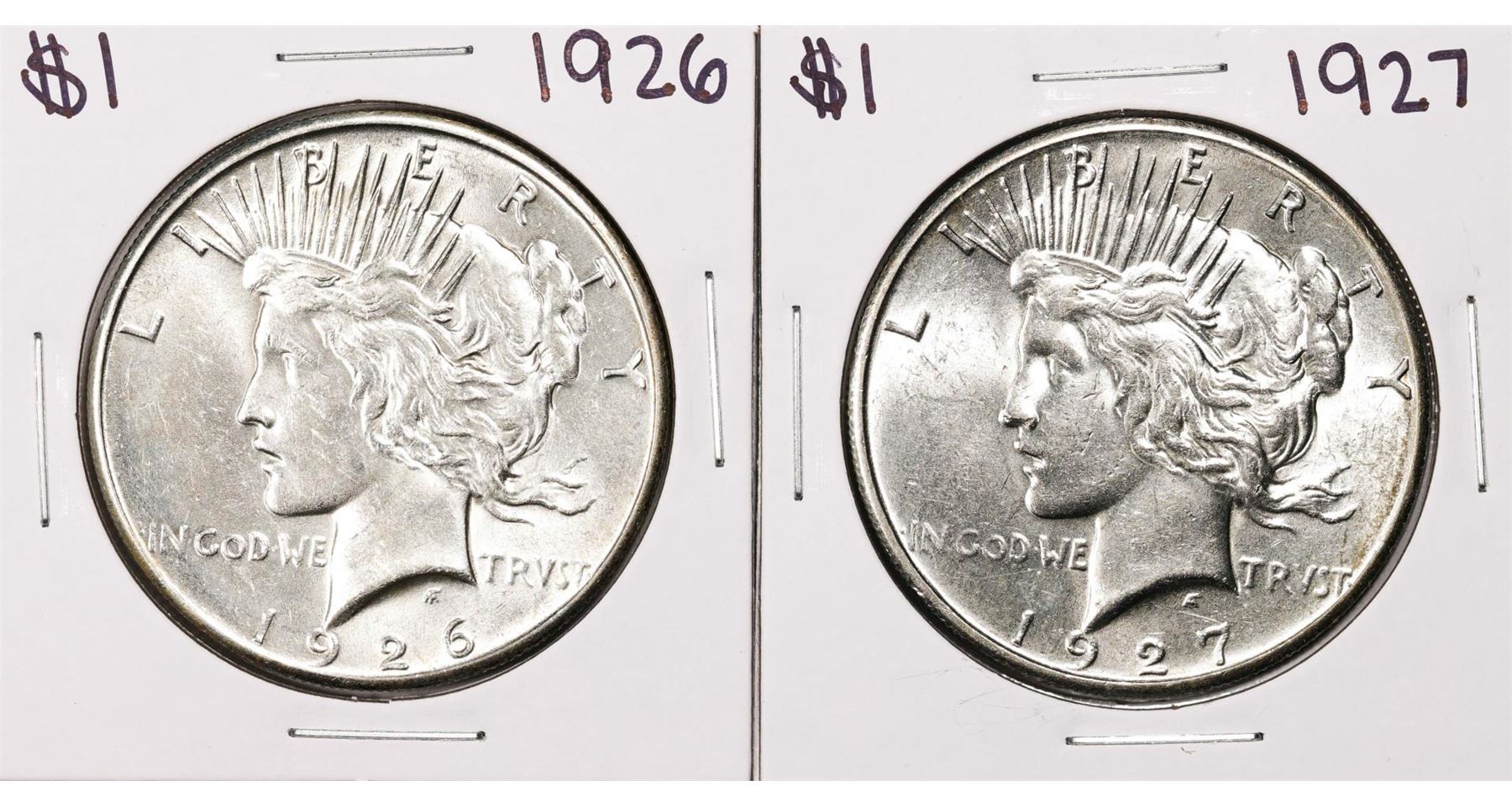 One Lot of 1926-1927 $1 Peace Silver Dollar Coins.