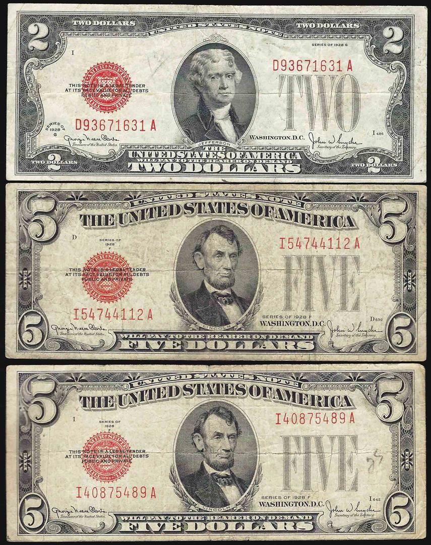 One Lot of 1928 $2 & (2) 1928 $5 Legal Tender Notes.