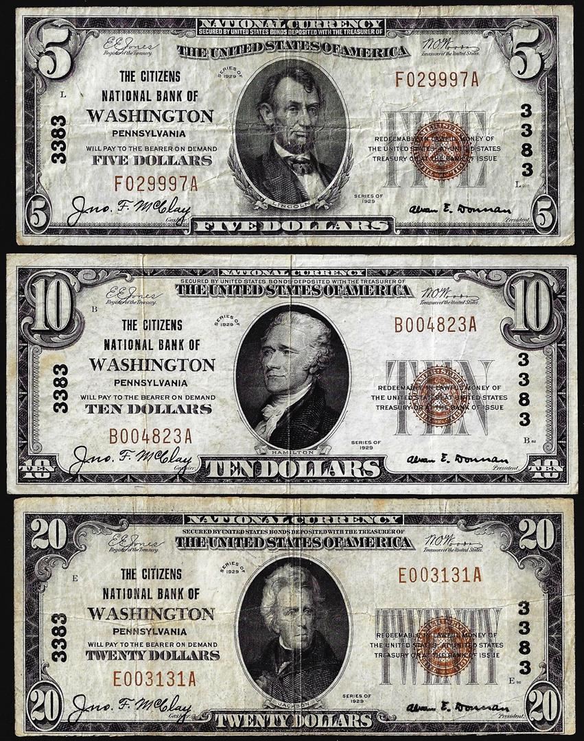 Lot of 1929 $5/10/20 Citizens NB Washington, PA CH# 3383 National Currency Notes
