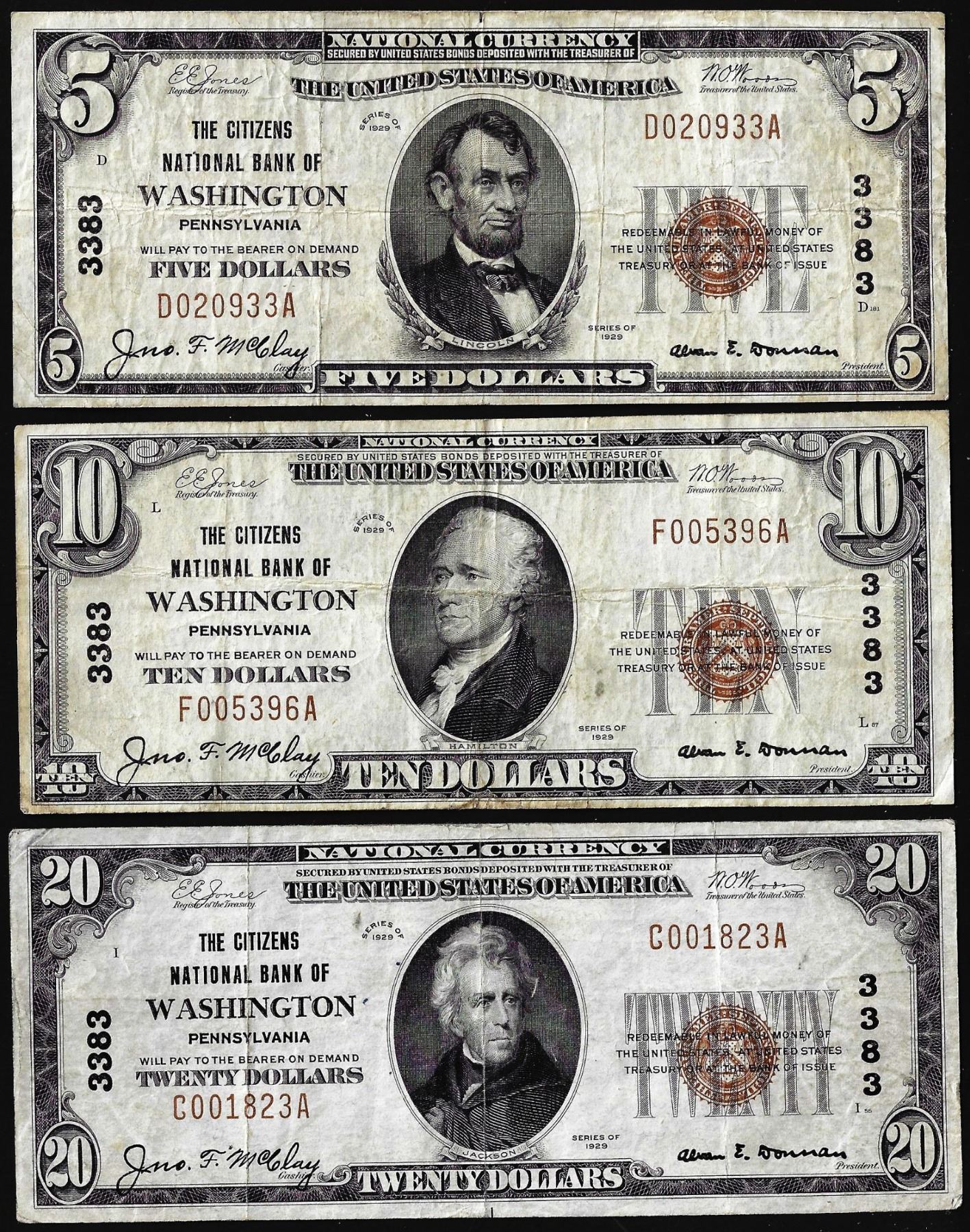 Lot of 1929 $5/10/20 Citizens NB Washington, PA CH# 3383 National Currency Notes