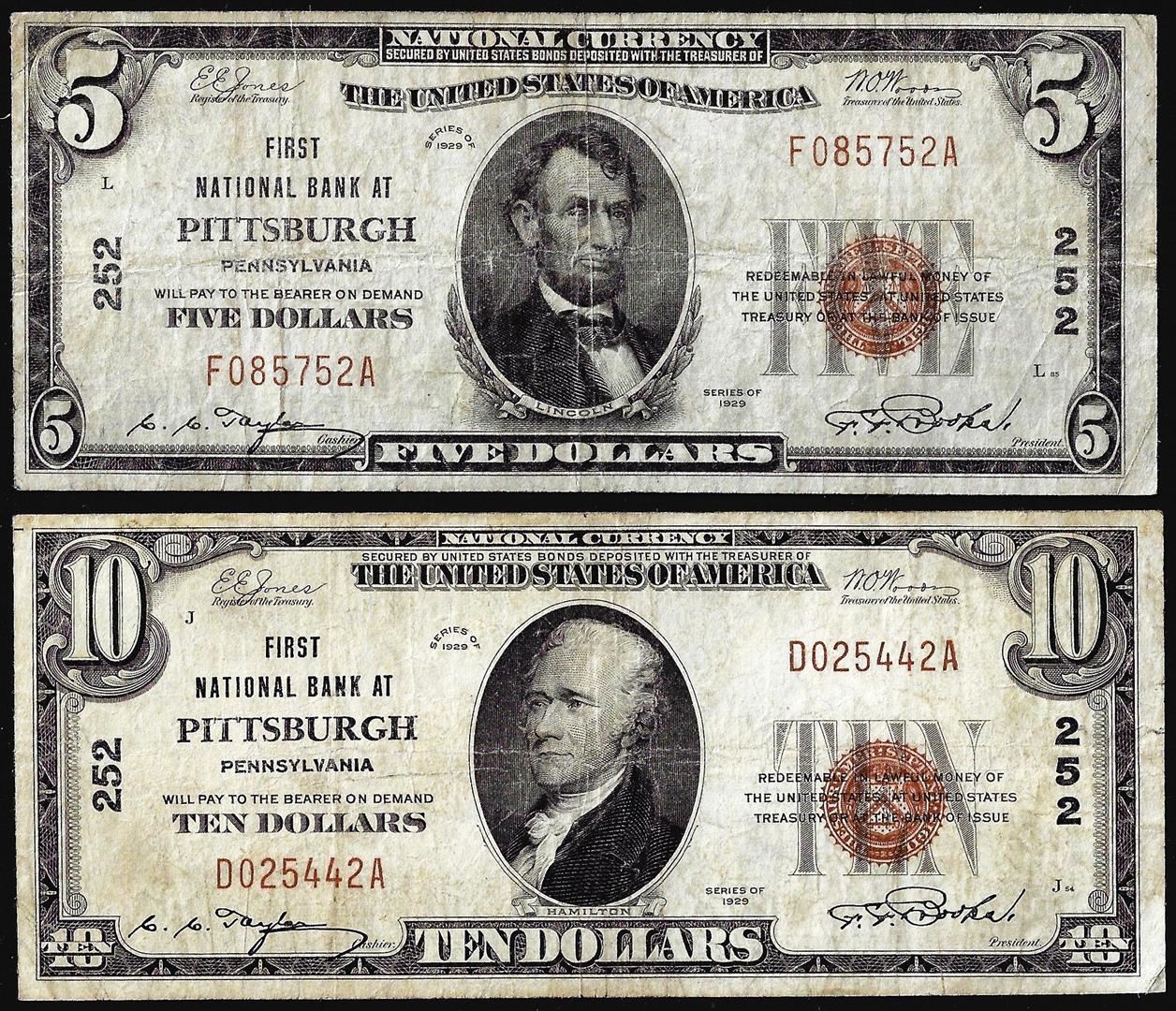 Lot of 1929 $5/$10 National Bank at Pittsburgh, PA CH# 252 National Currency Notes