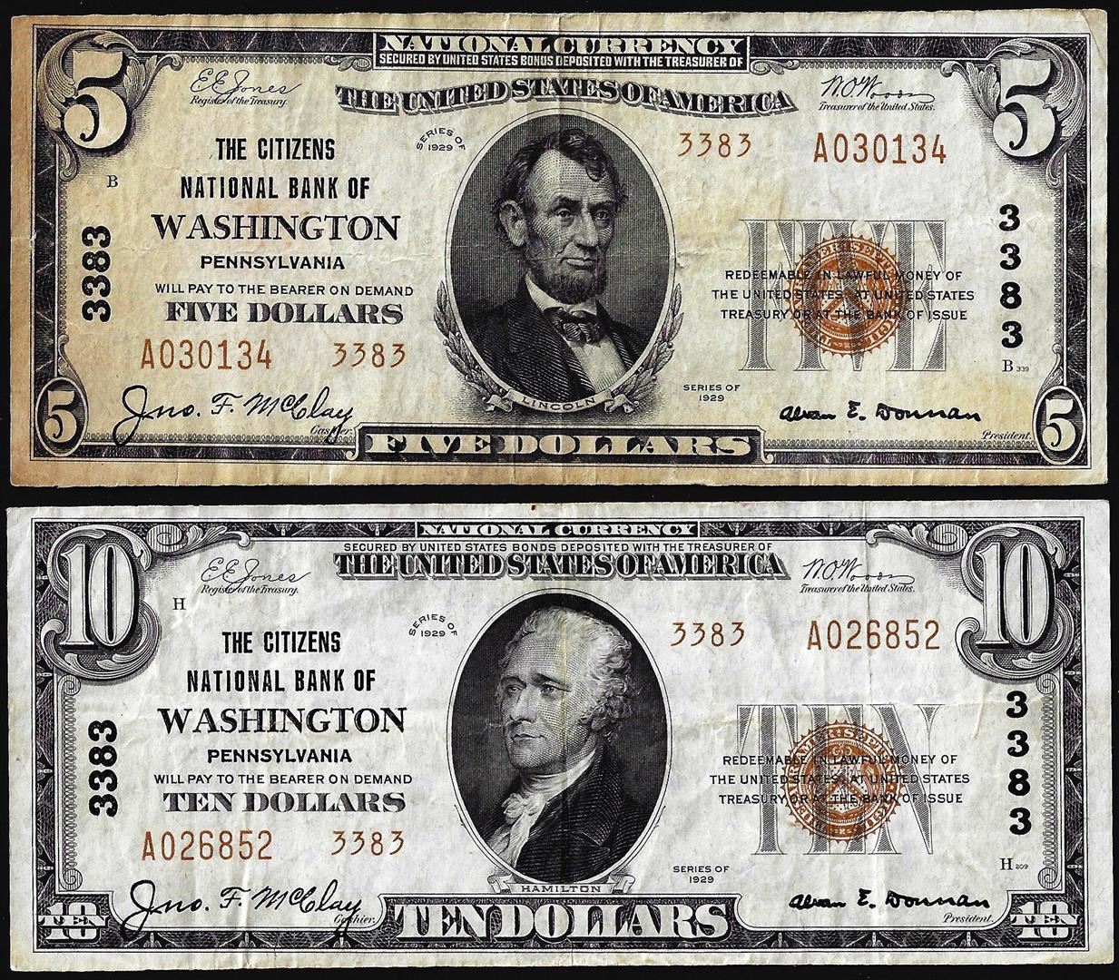 Lot of 1929 Ty. 2 $5/10 Citizens NB of Washington, PA CH# 3383 National Currency Notes