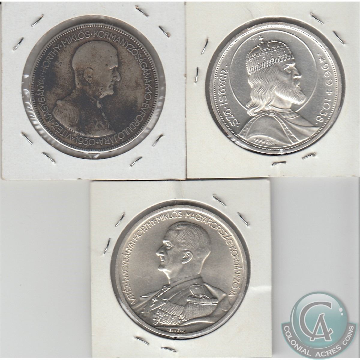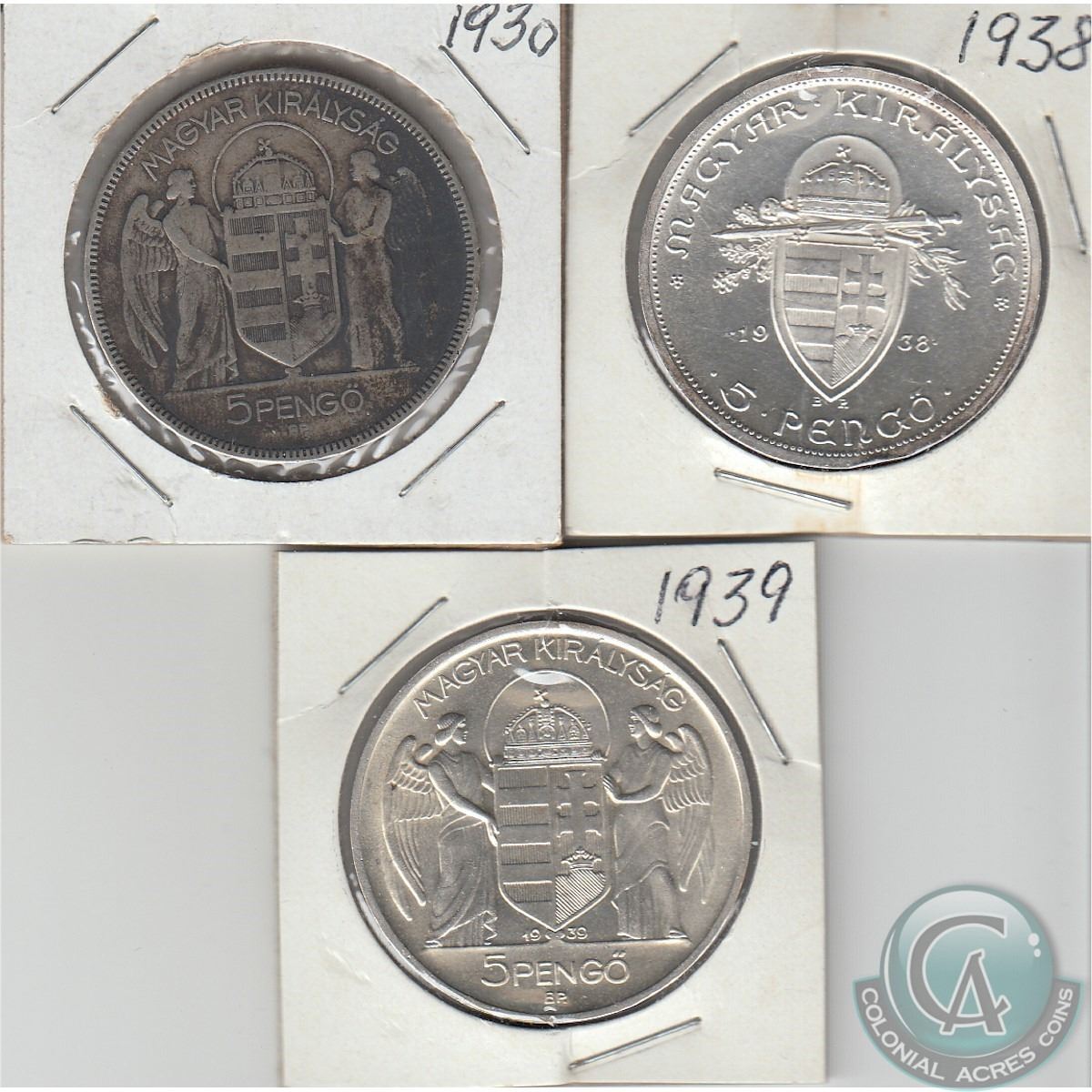 Lot of 1930, 1938, and 1939 Hungary 5 Pengo Silver Coins (3pcs)
