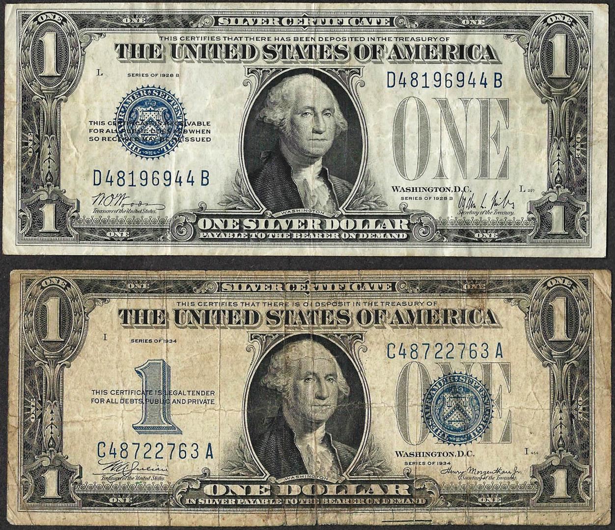 One Lot of 1934 & 1928B $1 Funnyback Silver Certificate Notes.