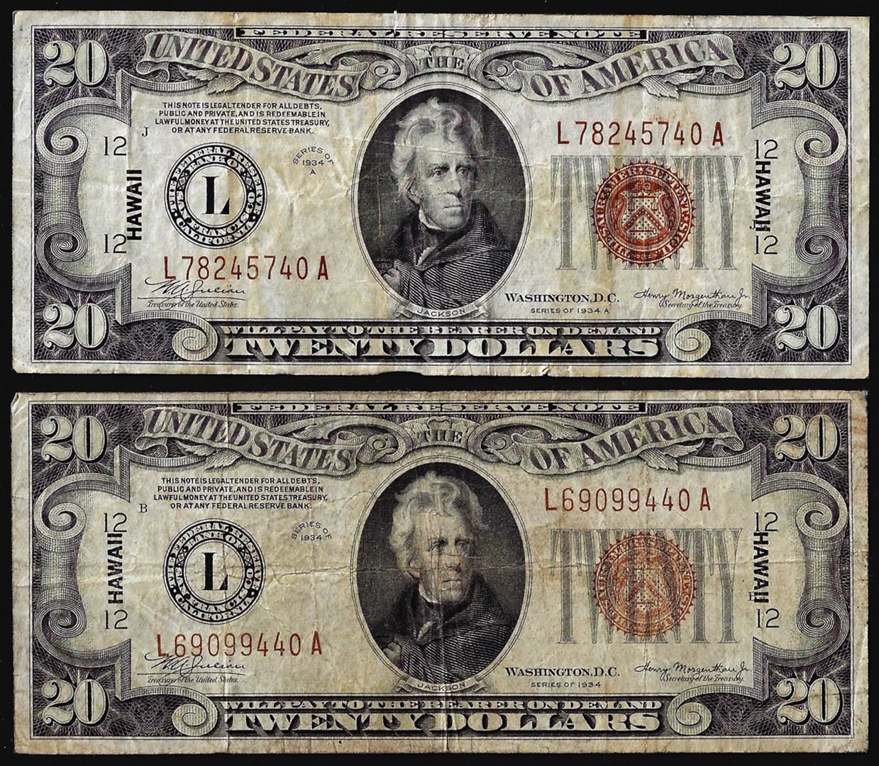 One Lot of 1934 & 1934A $20 Hawaii WWII Emergency Issue Federal Reserve Notes.