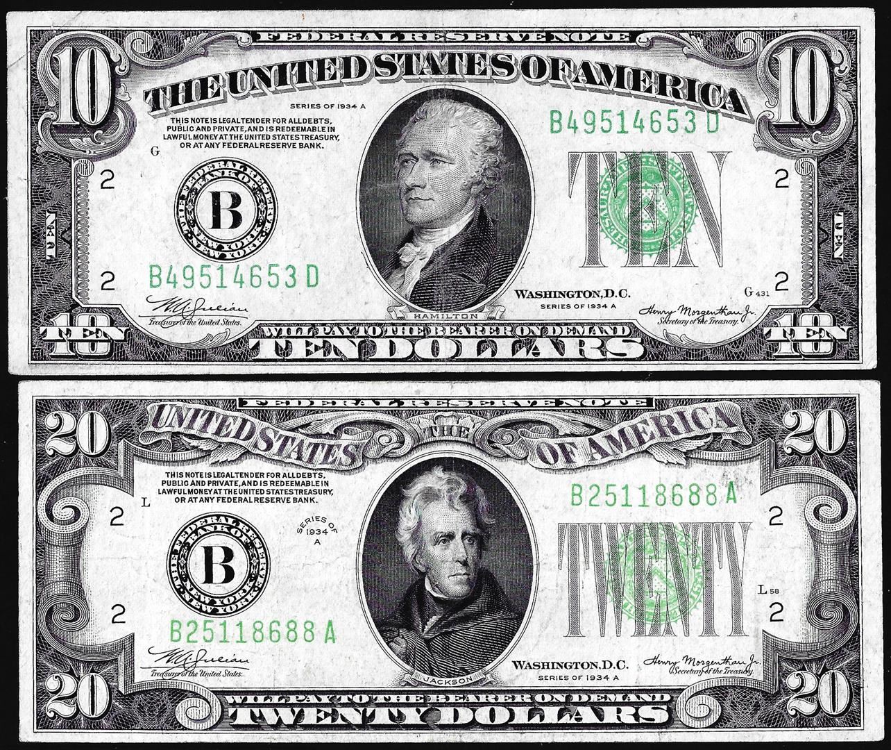 One Lot of 1934A $10 & $20 Federal Reserve Notes New York.