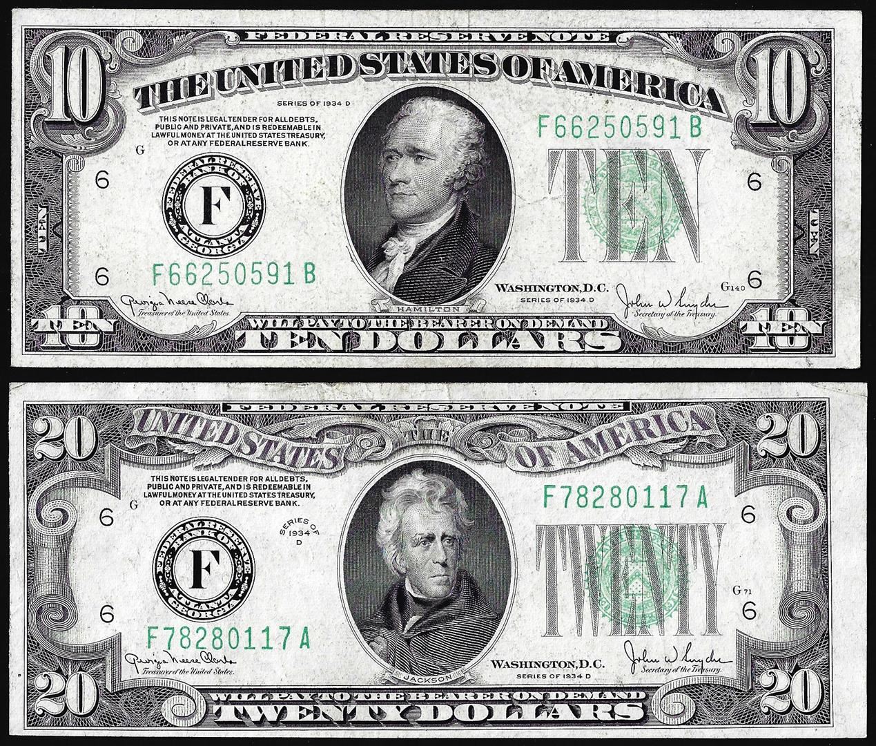 One Lot of 1934D $10 & $20 Federal Reserve Notes Atlanta.