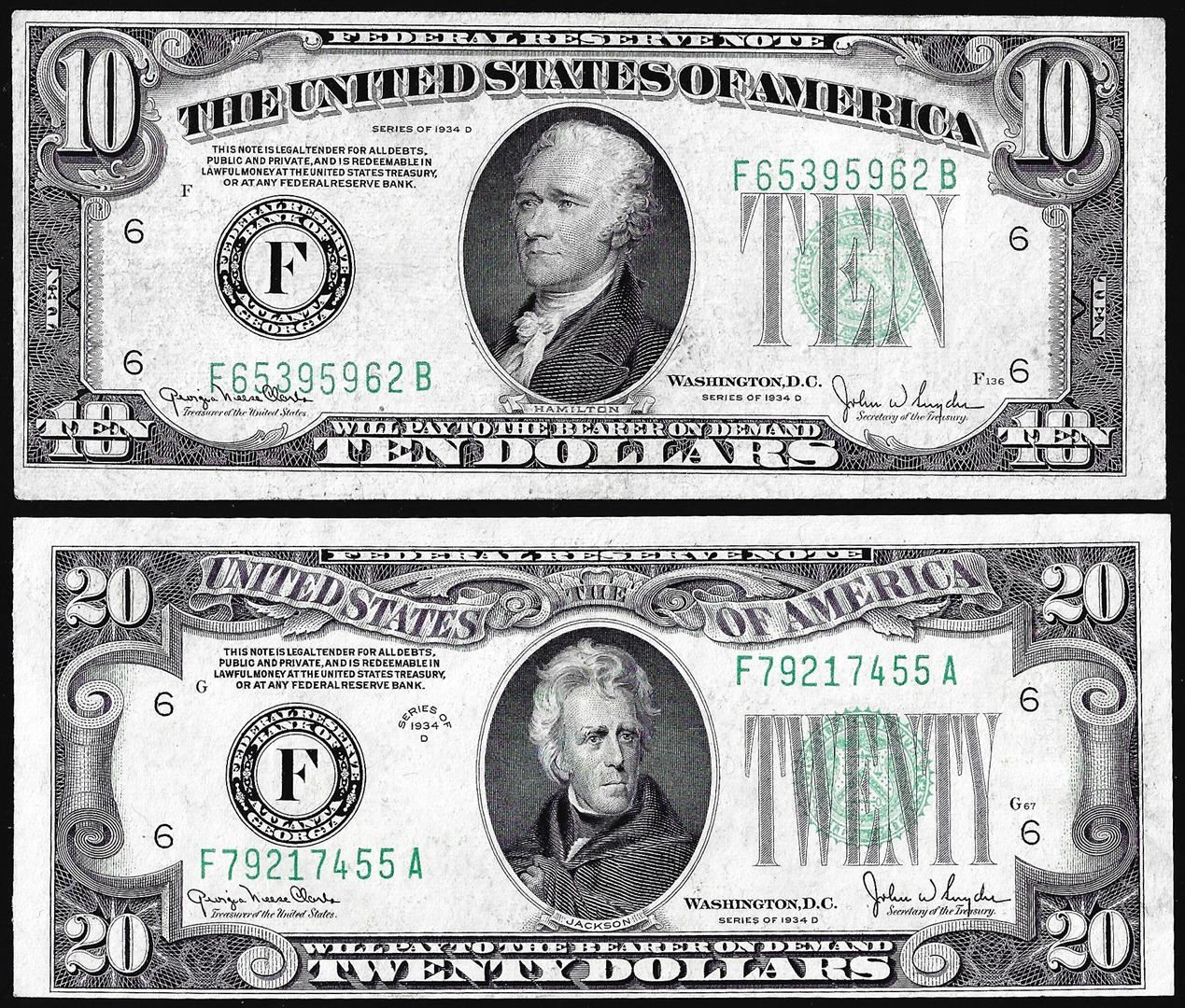 One Lot of 1934D $10 & $20 Federal Reserve Notes Atlanta.