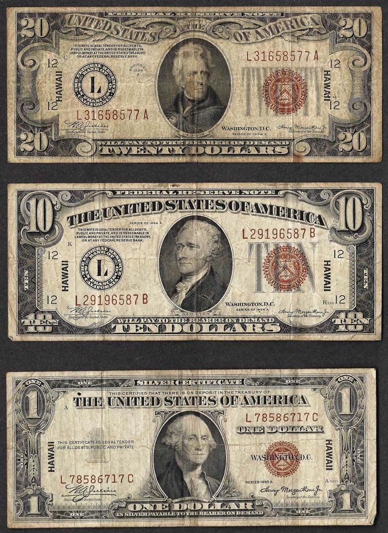 Lot of 1935A $1 & 1934A $10/$20 Silver Certificate WWII Emergency Hawaii Note