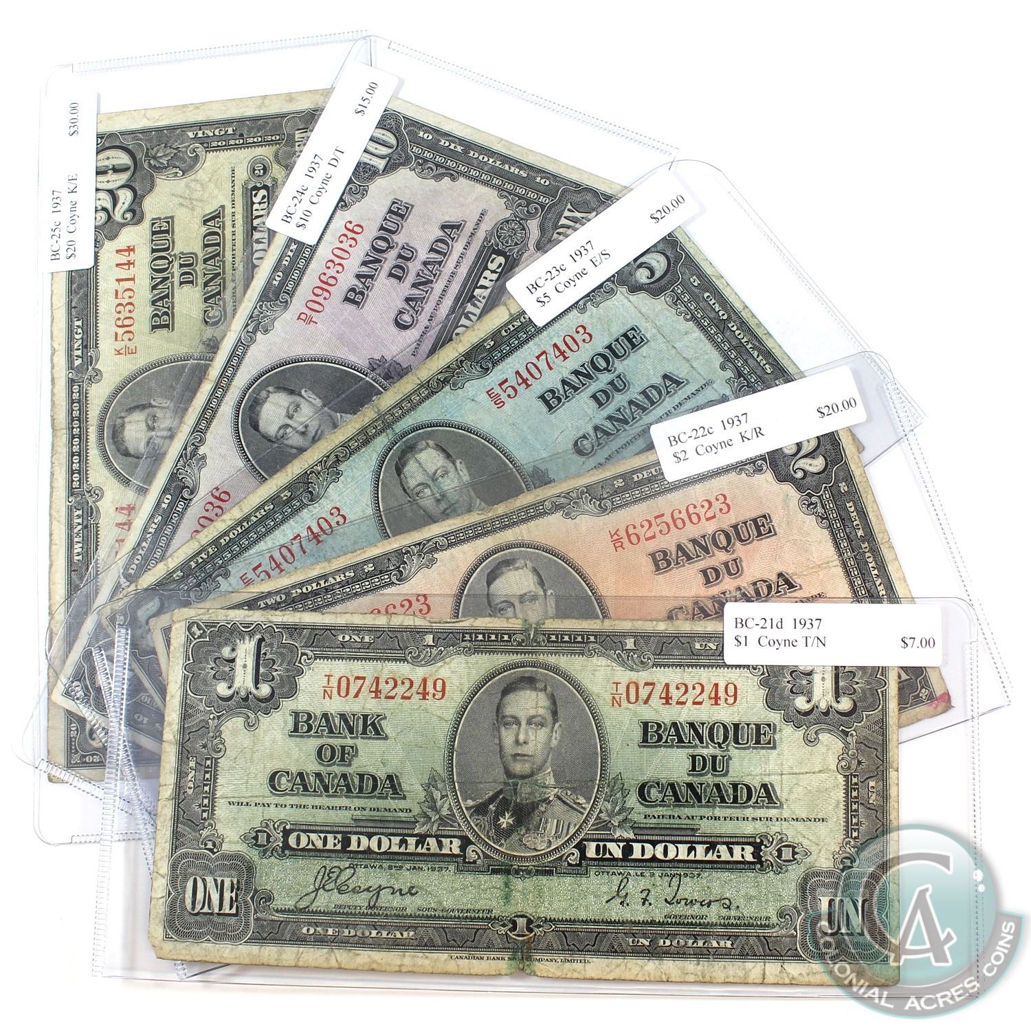 Lot of 1937 $1, $2, $5, $10 & $20 Bank of Canada Notes with Coyne-Towers Signatures. You will receive $1 prefix T/N, $2 prefix K/R, $5 prefix E/S, $10 prefix D/T & $20 prefix K/E. 5pcs