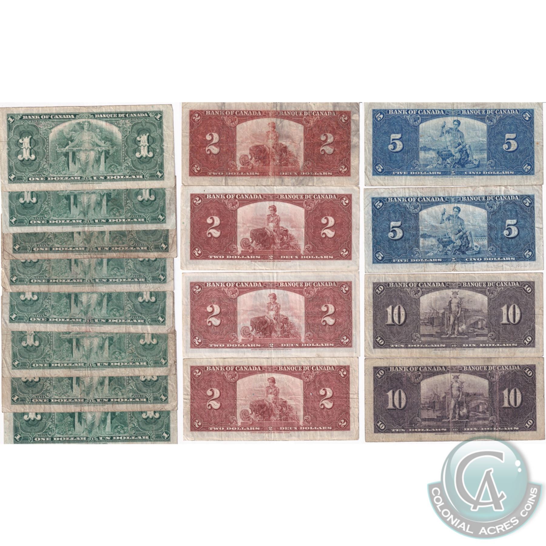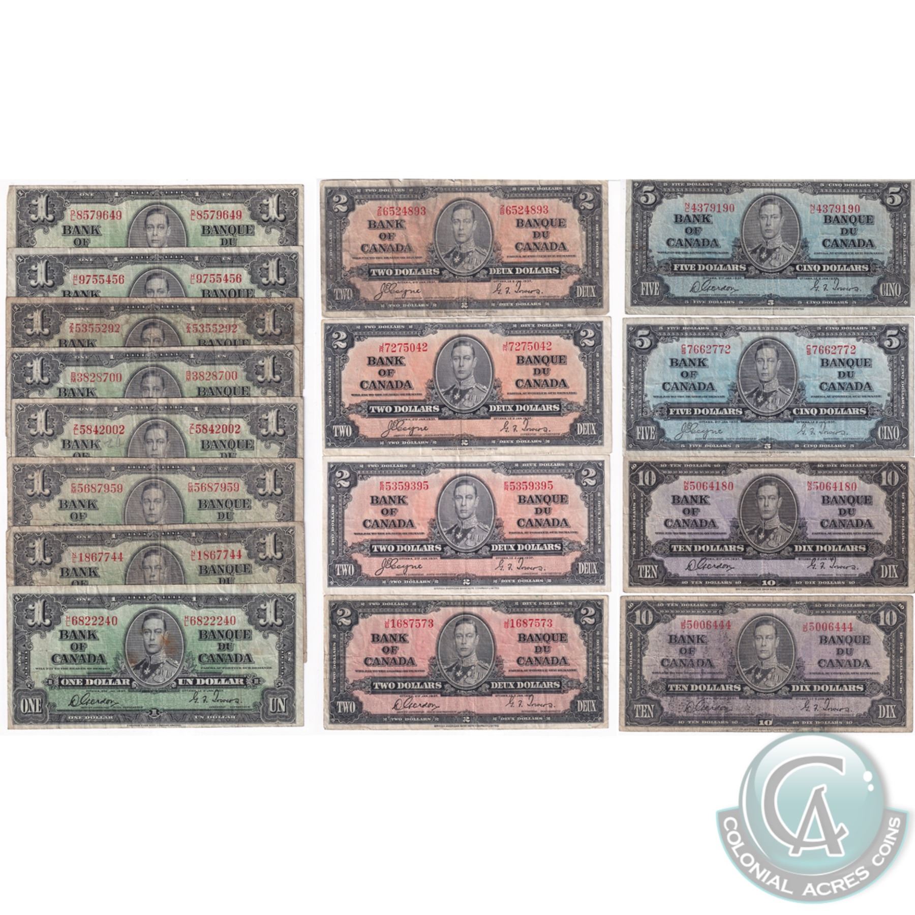 Lot of 1937 Bank of Canada $1, $2, $5 & $10 Notes in average condition (8x $1, 4x $2, 2x $5 & 2x $10). 16pcs