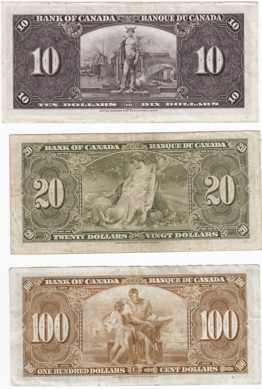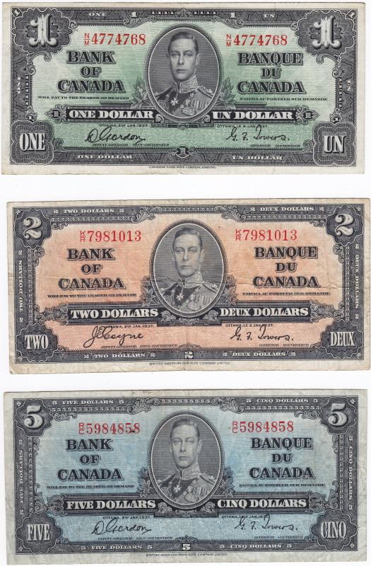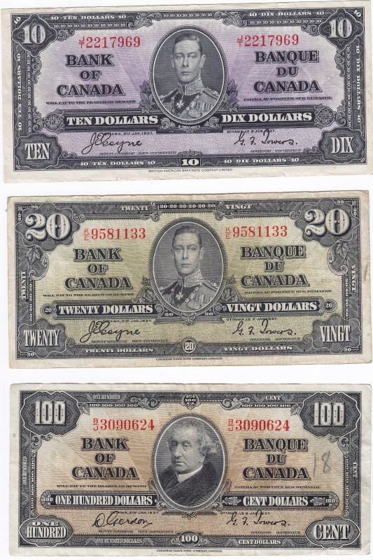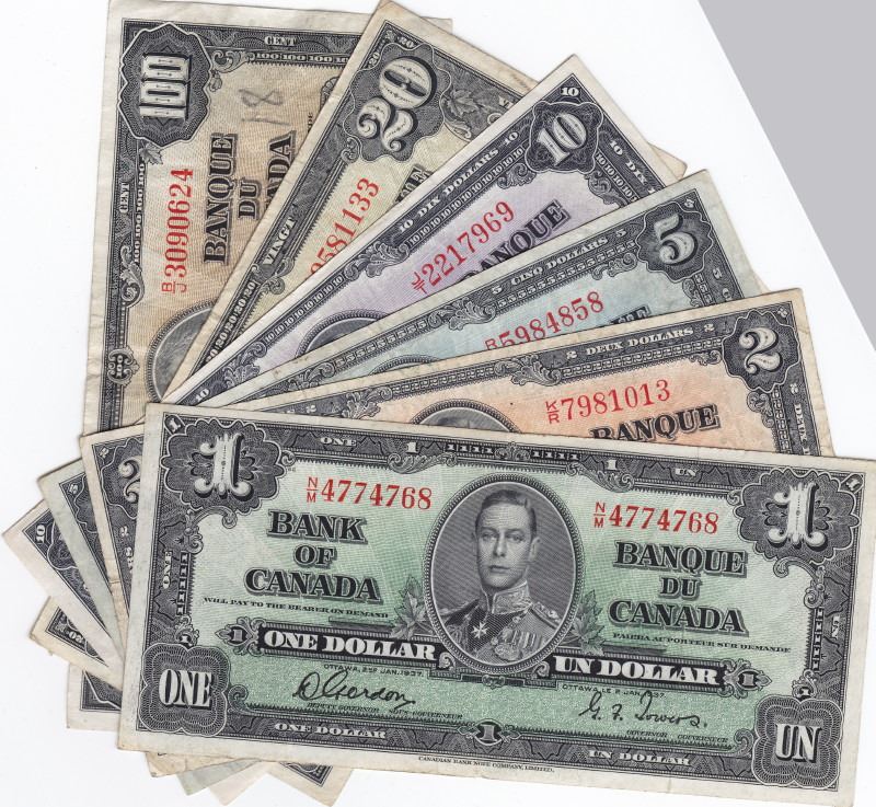 Lot of 1937 Canadian - Bank of Canada - Bank Notes - $1 (VF), $2 (F+), $5 (VF), $10 (EF+), $20 (VF), $100 (VF, Grafitti)