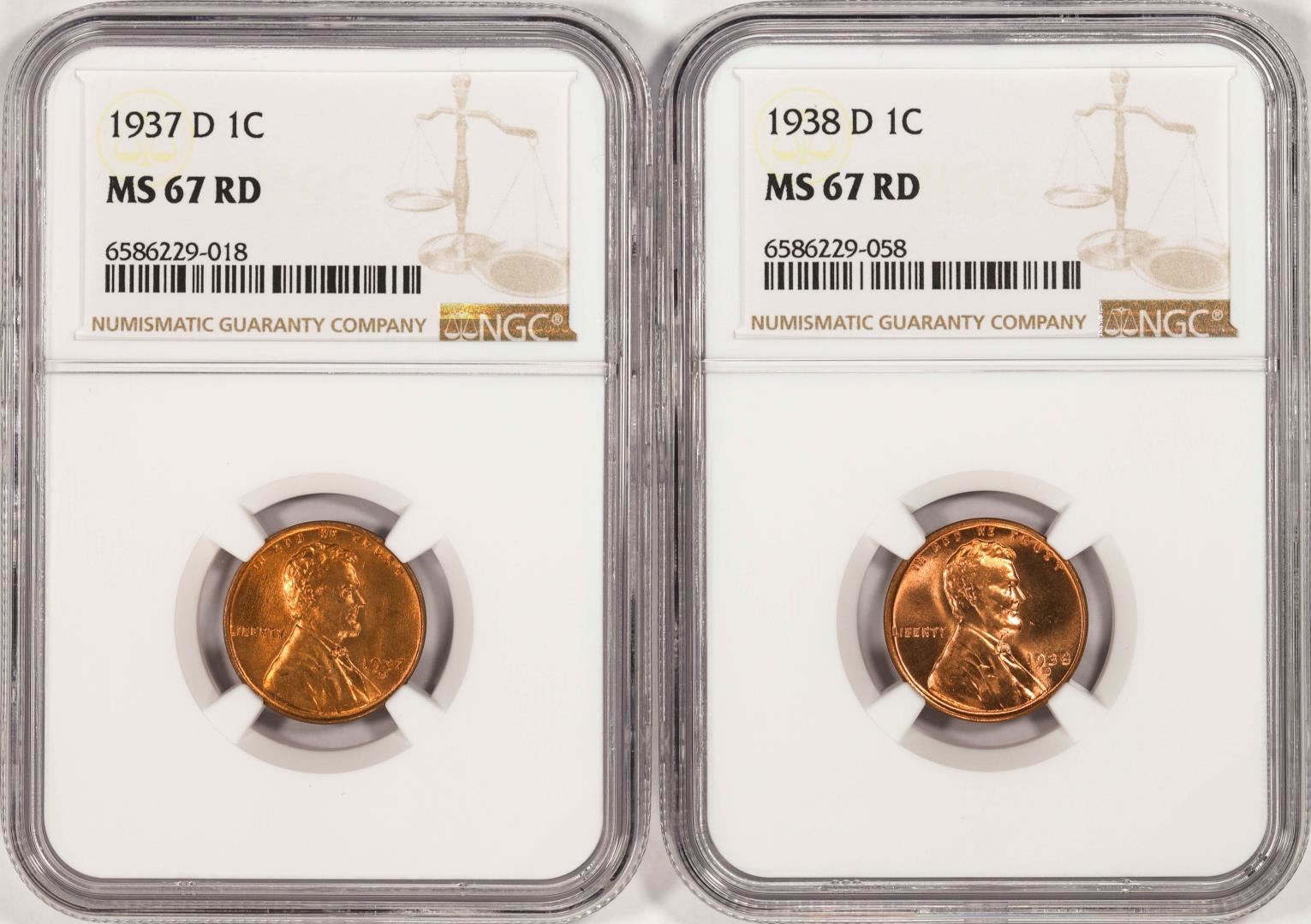 One Lot of 1937-D & 1938-D Lincoln Wheat Cent Coins NGC MS67RD. NGC Certified.
