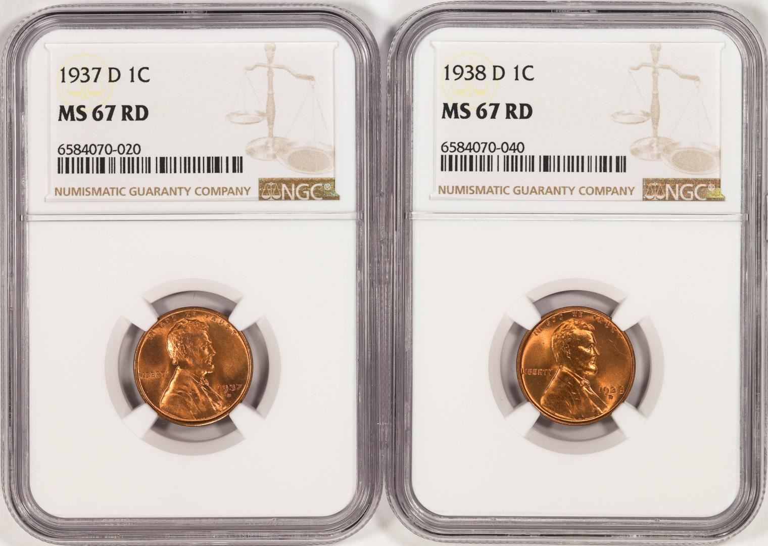 One Lot of 1937-D & 1938-D Lincoln Wheat Cent Coins NGC MS67RD. NGC Certified.