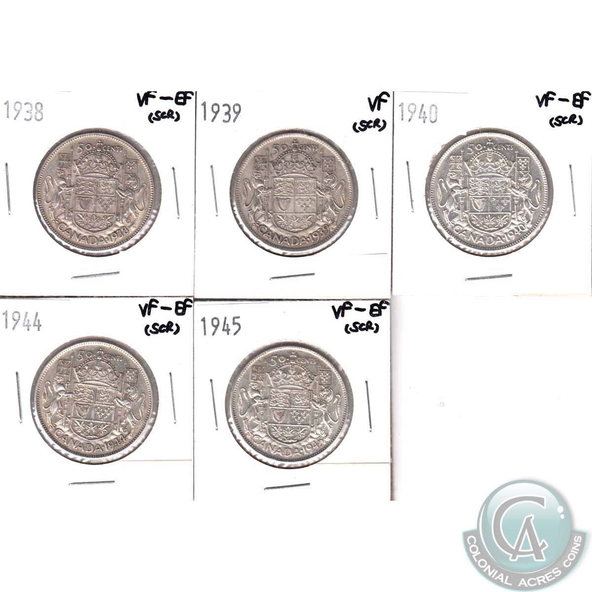 Lot of 1938-1945 Canada 50-cent All VF-EF, Except 1939 is VF (coins are scratched). 5pcs
