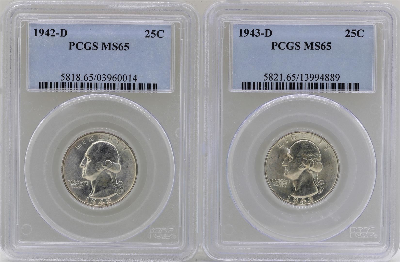 One Lot of 1942-D & 1943-D Washington Quarter Coins PCGS MS65. PCGS Graded.