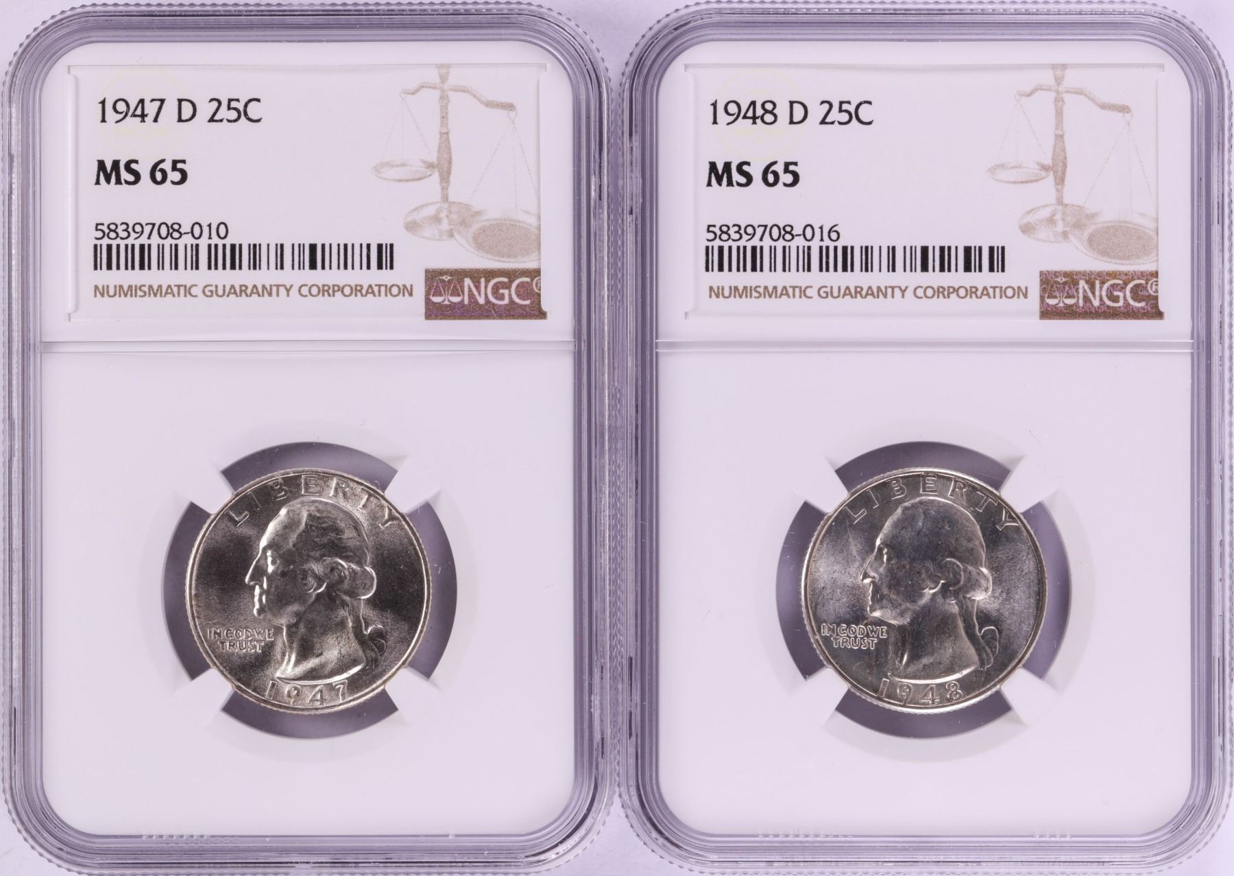 One Lot of 1947-D & 1948-D Washington Quarter Coins NGC MS65.