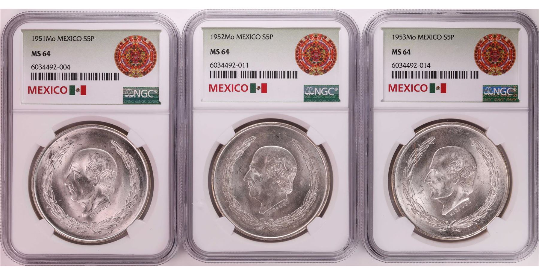 One Lot of 1951-1953Mo Mexico 5 Pesos Silver Coins NGC MS64. NGC Certified.