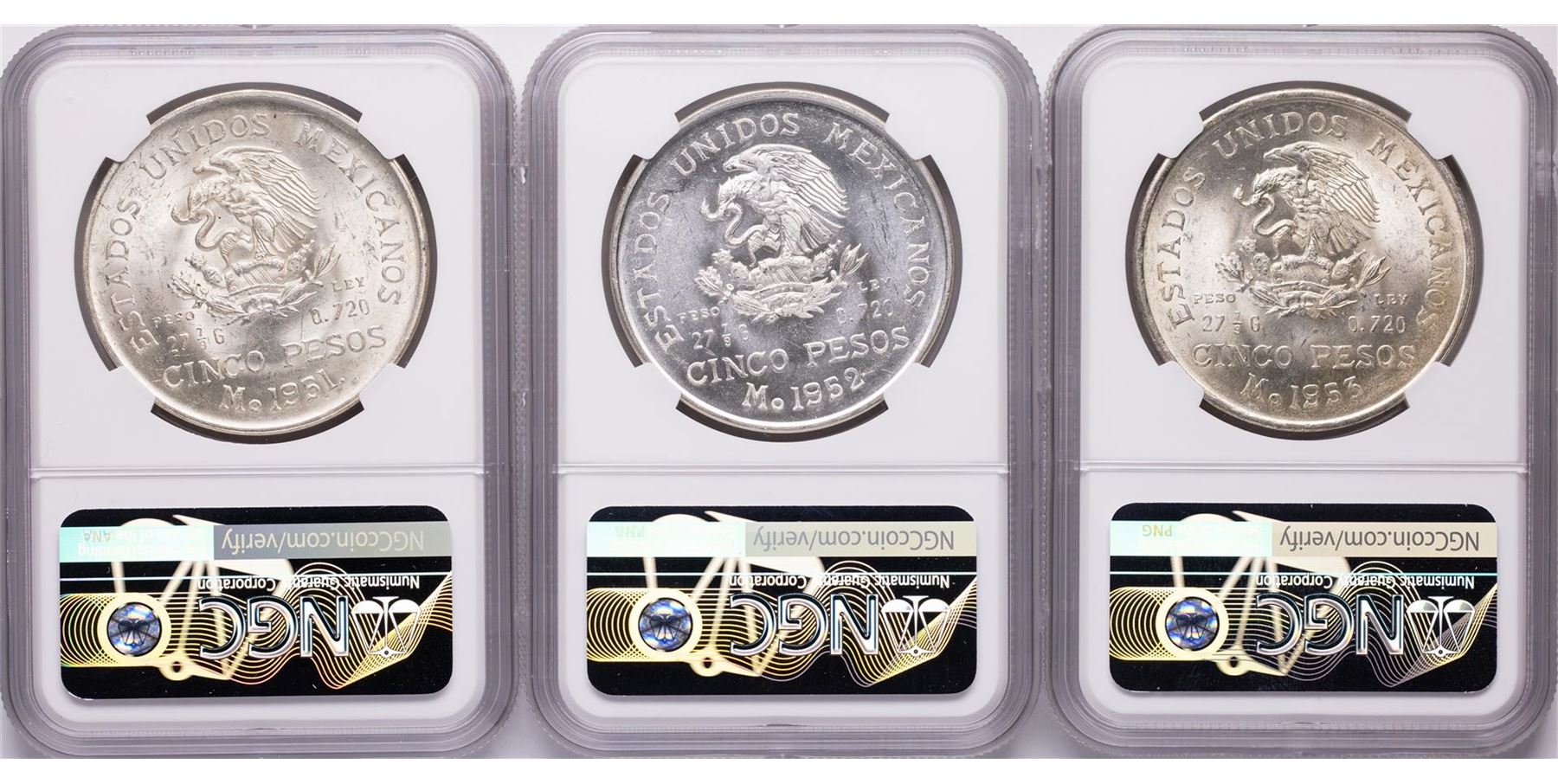 One Lot of 1951Mo-1953Mo Mexico 5 Pesos Silver Coins NGC MS63. NGC Certified.