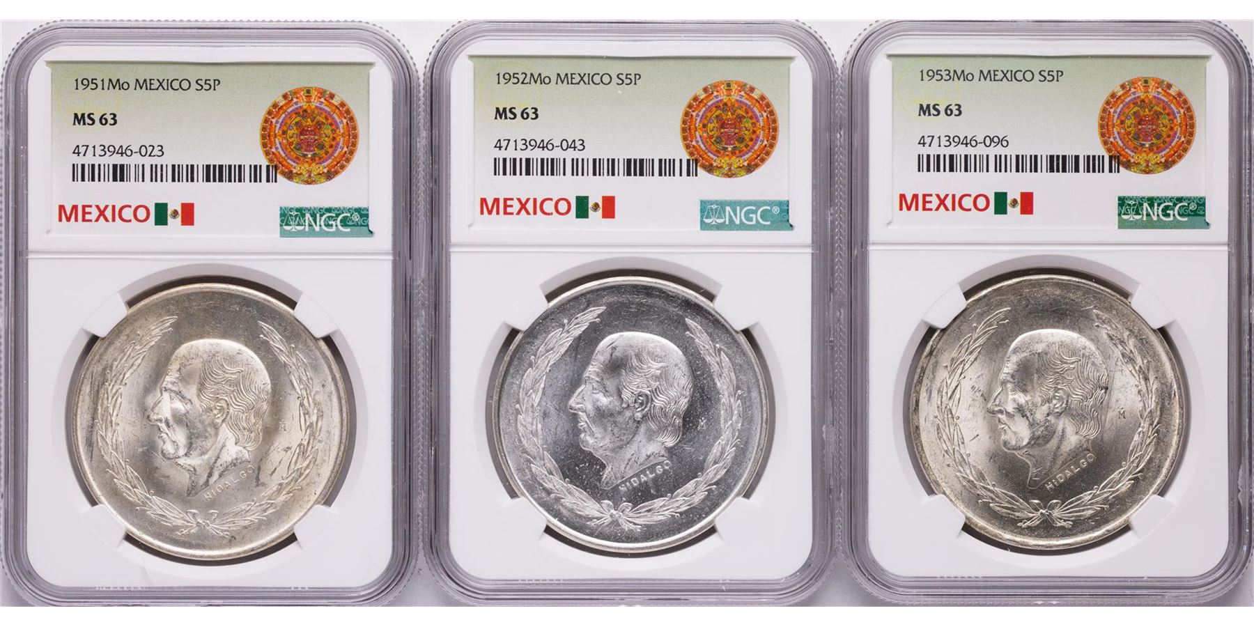One Lot of 1951Mo-1953Mo Mexico 5 Pesos Silver Coins NGC MS63. NGC Certified.