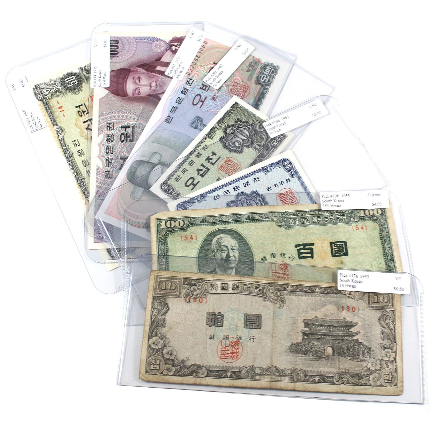 Lot of 1953-1975 South Korea Banknotes - Pick #17a, 19b, 28a, 29a, 40a, 43 & 44 VG to UNC (4 notes are UNC). #19b has some staining. 7pcs