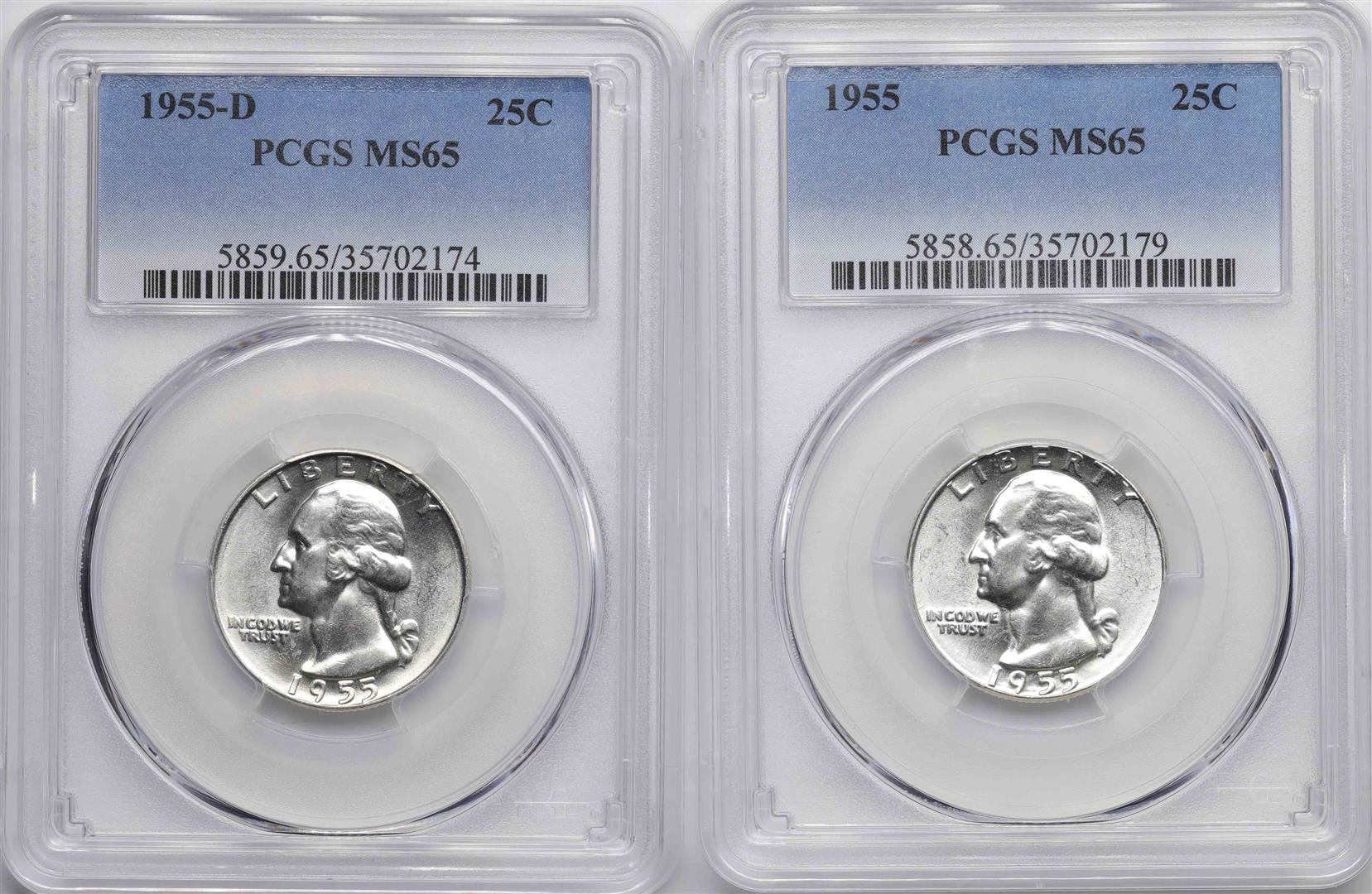 One Lot of 1955 & 1955-D Washington Quarter Coins PCGS MS65. PCGS Graded.
