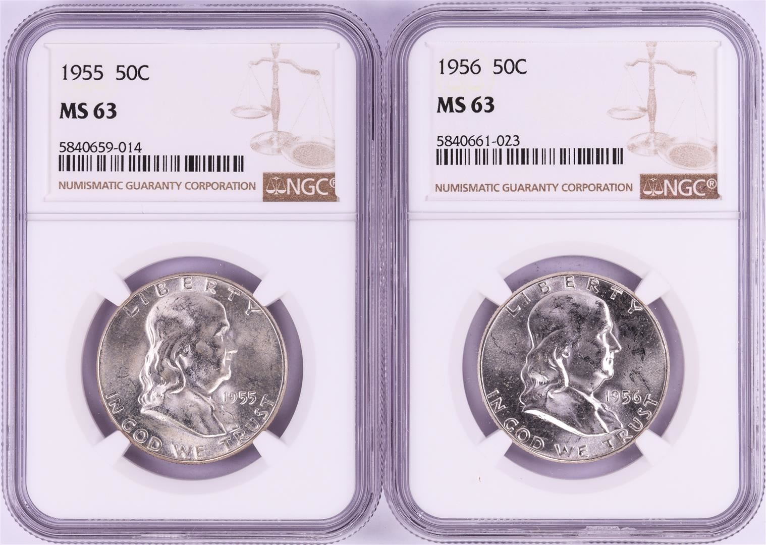 One Lot of 1955-1956 Franklin Half Dollar Coins NGC MS63. NGC Certified.