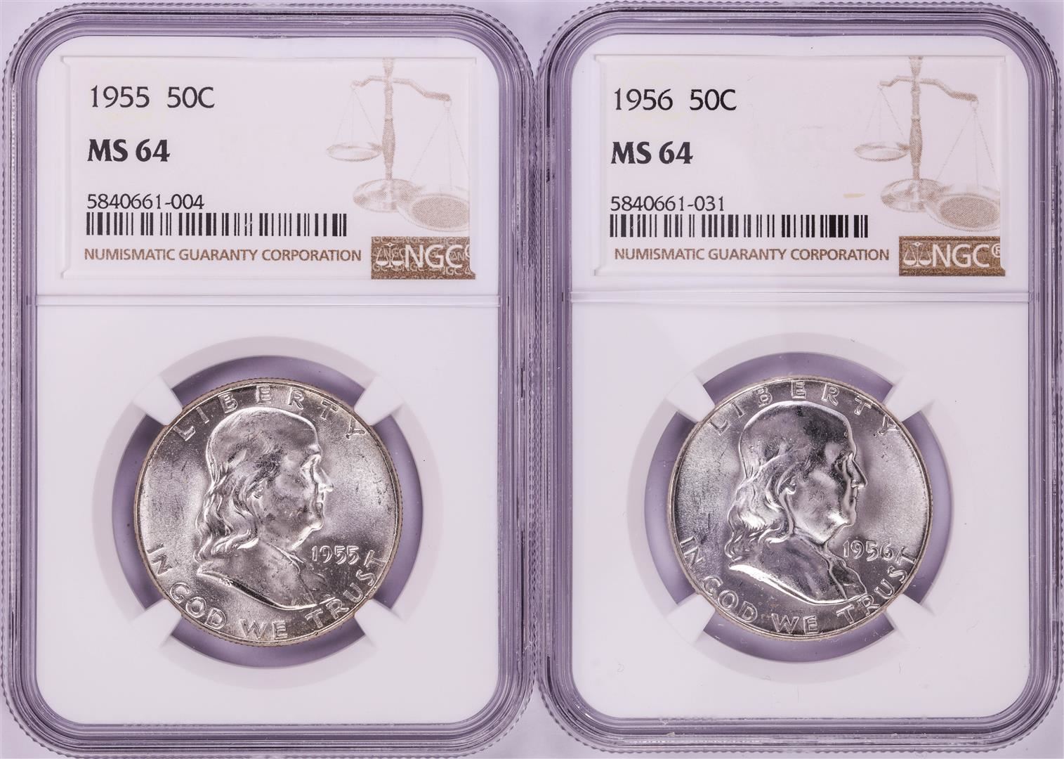 One Lot of 1955-1956 Franklin Half Dollar Coins NGC MS64. NGC Certified.