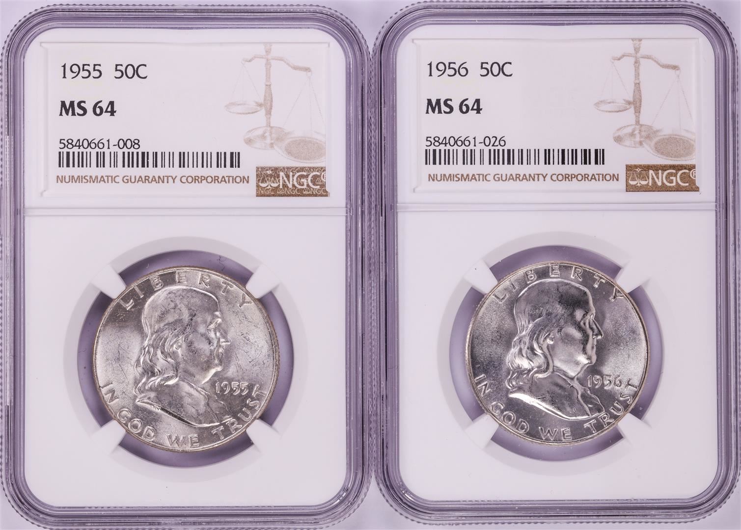 One Lot of 1955-1956 Franklin Half Dollar Coins NGC MS64. NGC Certified.