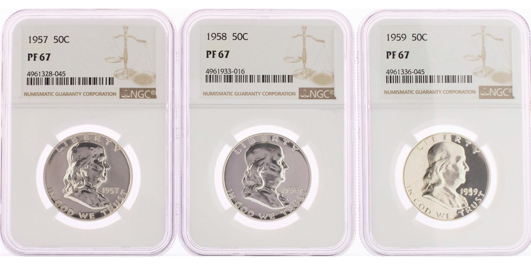 One Lot of 1957-1959 Proof Franklin Half Dollar Coins NGC PF67. NGC Certified.