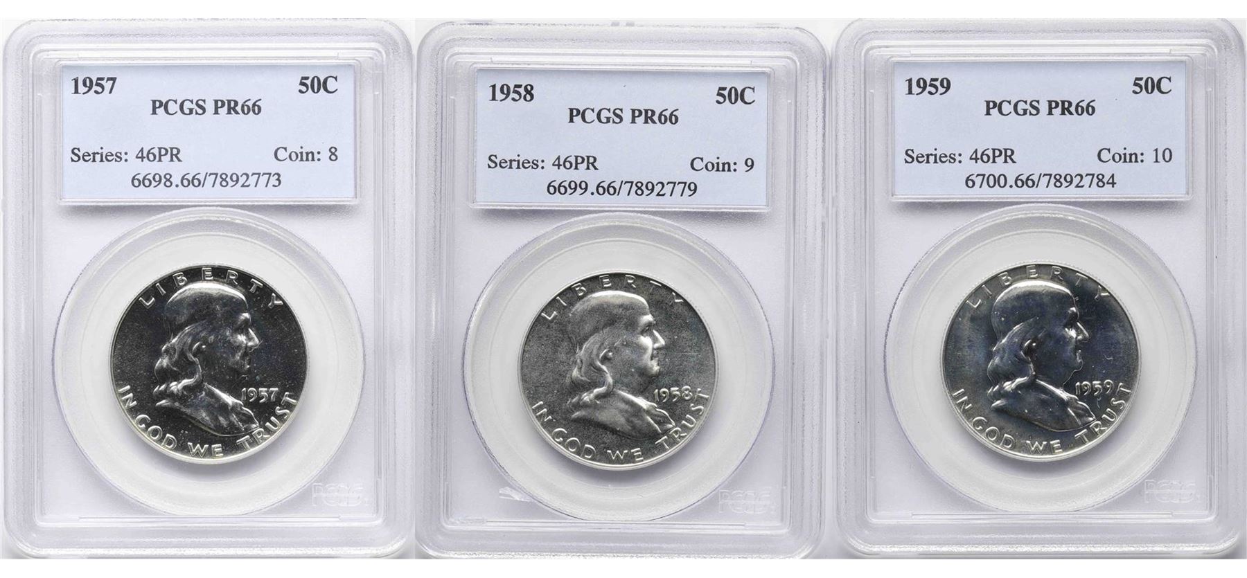 One Lot of 1957-1959 Proof Franklin Half Dollar Coins PCGS PR66. PCGS Graded.