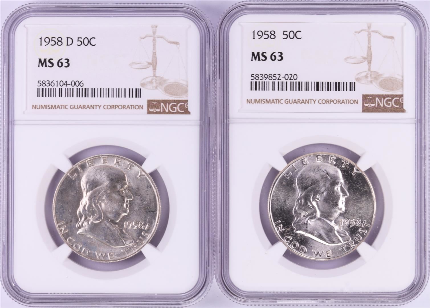 One Lot of 1958 & 1958-D Franklin Half Dollar Coins NGC MS63. NGC Certified.