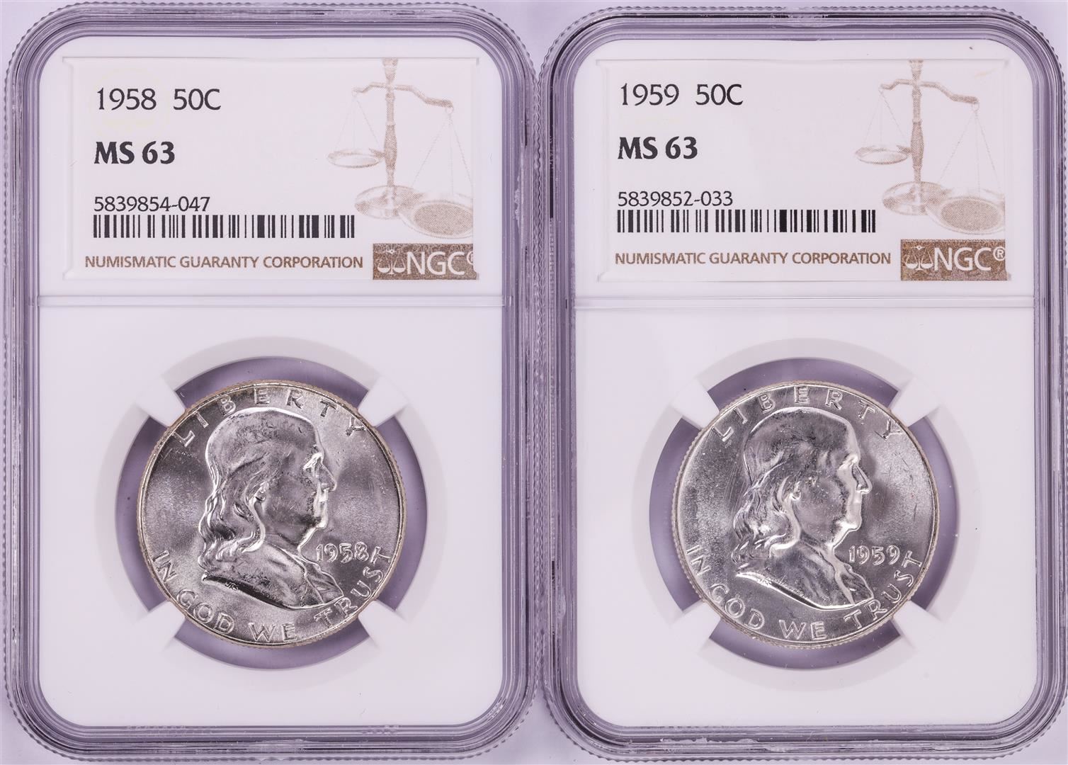 One Lot of 1958-1959 Franklin Half Dollar Coins NGC MS63. NGC Certified.