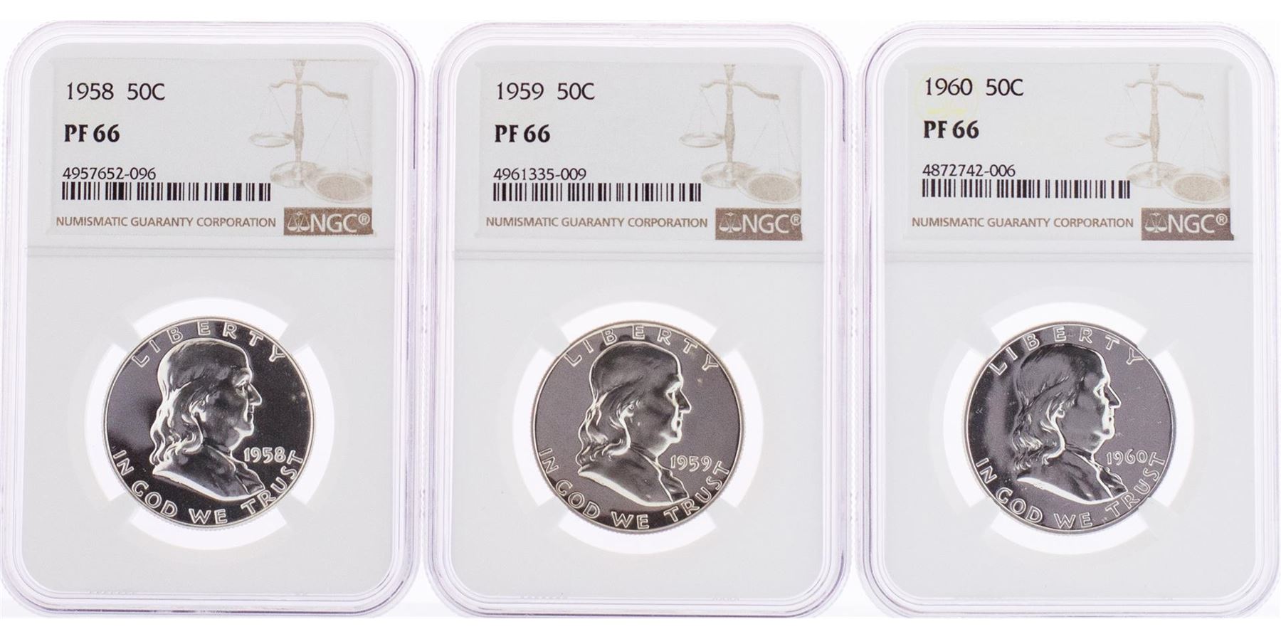 One Lot of 1958-1960 Proof Franklin Half Dollar Coins NGC PF66. NGC Certified.