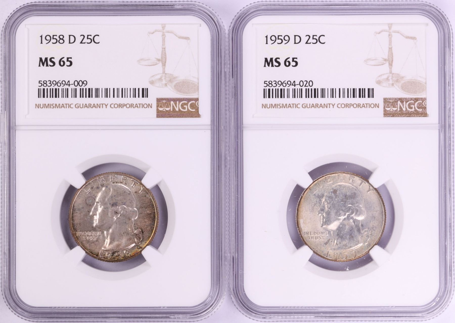 One Lot of 1958-D & 1959-D Washington Quarter Coins NGC MS65.