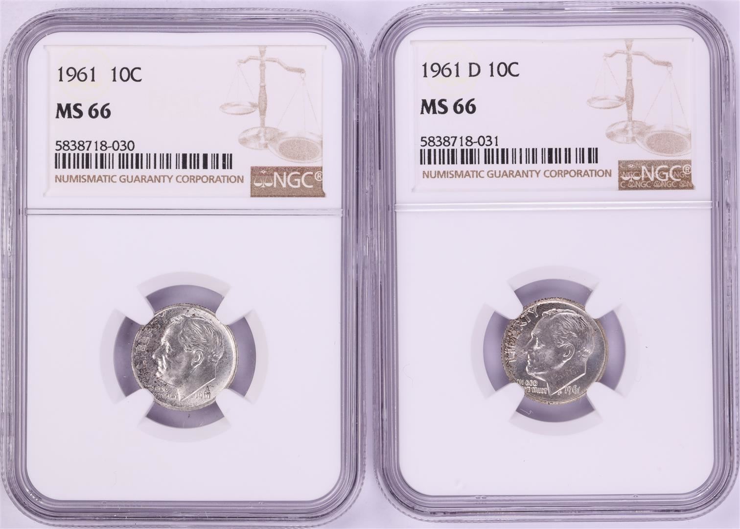 One Lot of 1961 & 1961-D Roosevelt Dime Coins NGC MS66. NGC Certified.