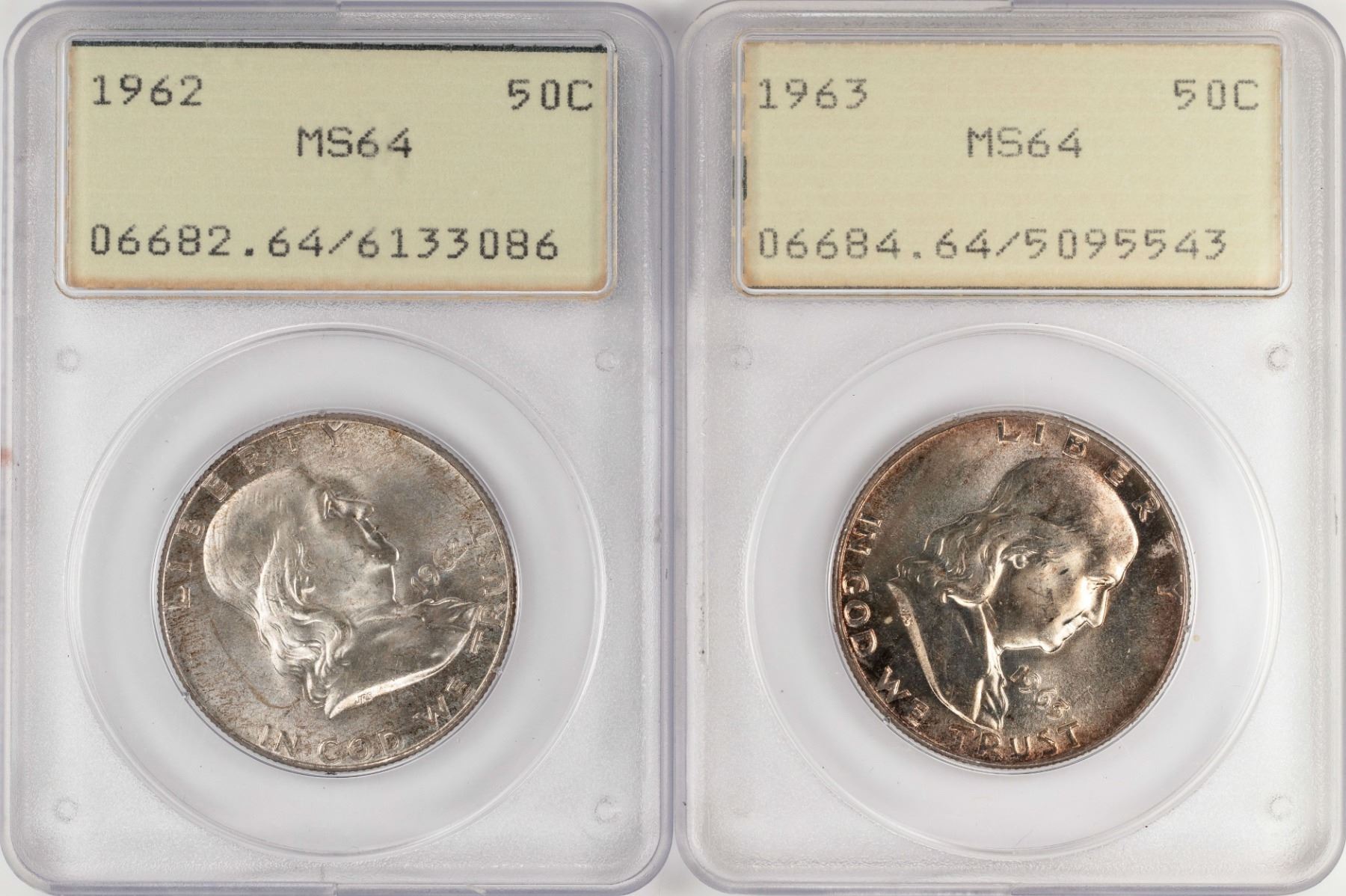 One Lot of 1962-1963 Franklin Half Dollar Coins PCGS MS64 Old Green Rattlers.