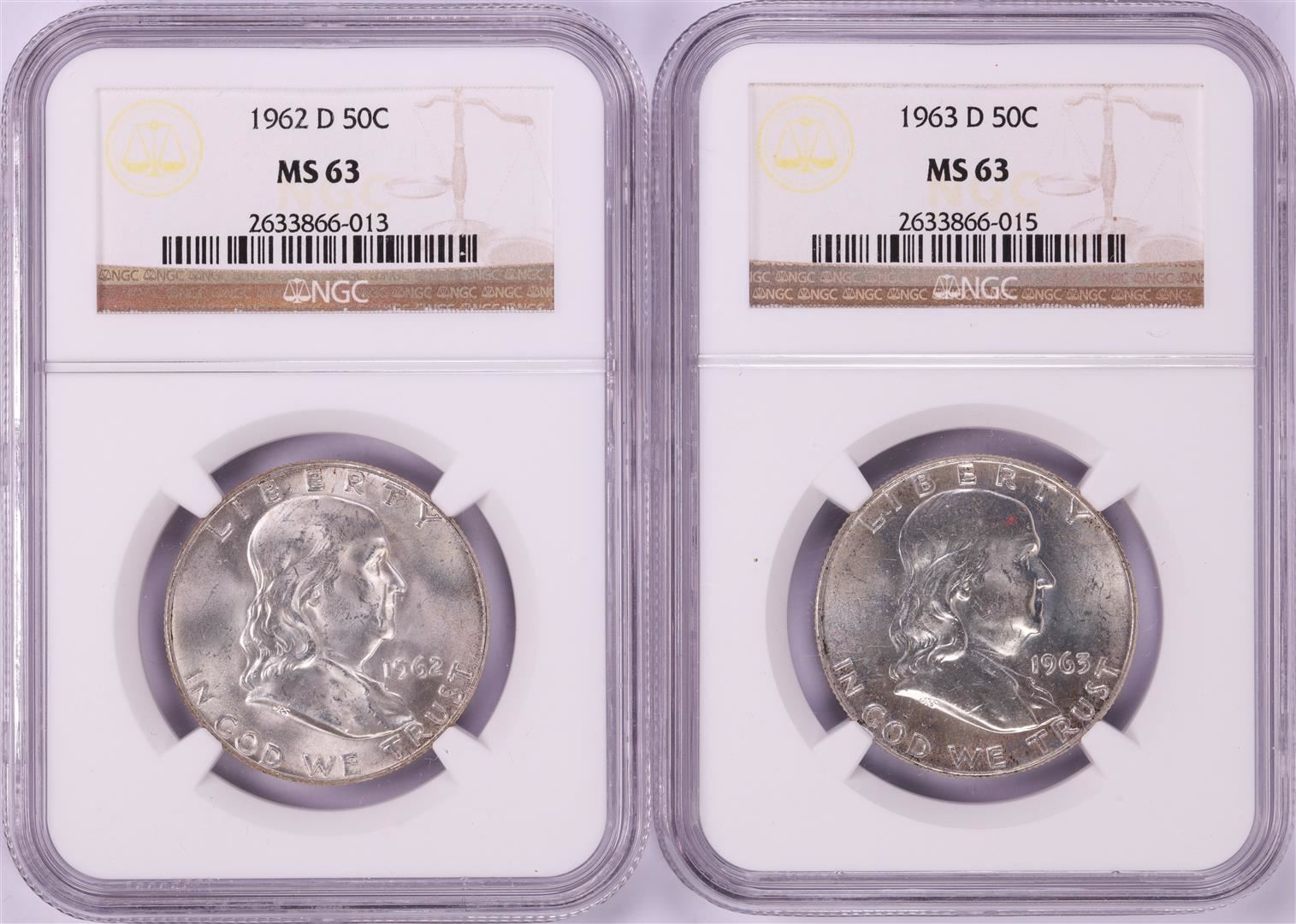 One Lot of 1962-D & 1963-D Franklin Half Dollar Coins NGC MS63. NGC Certified.