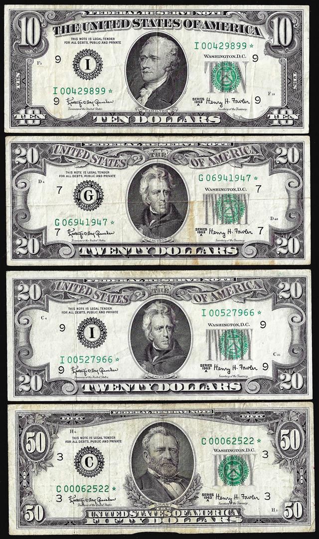 One Lot of 1963A $10/$20/$20/$50 Federal Reserve Star Notes.