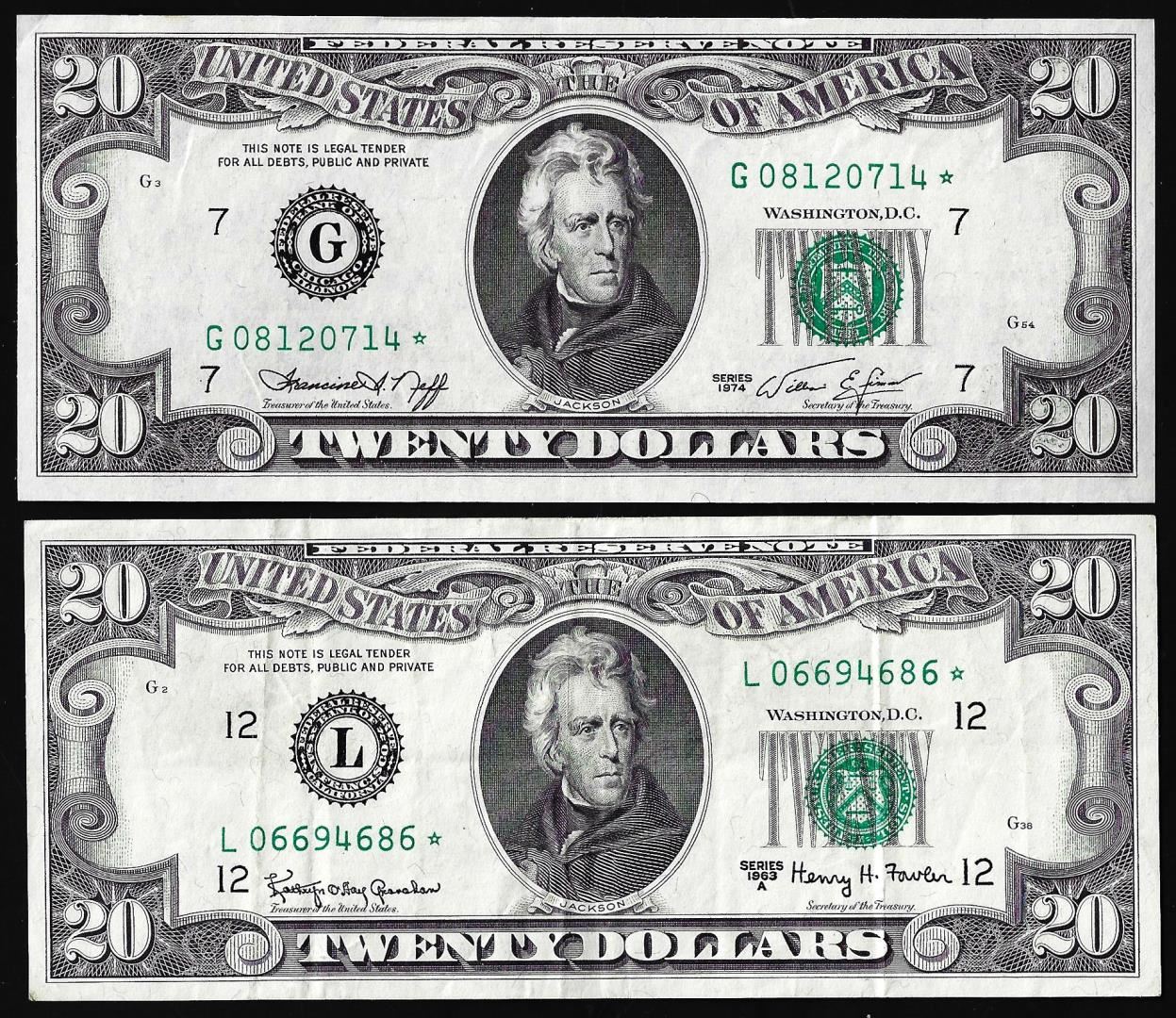 One Lot of 1963A & 1974 $20 Federal Reserve Star Notes.