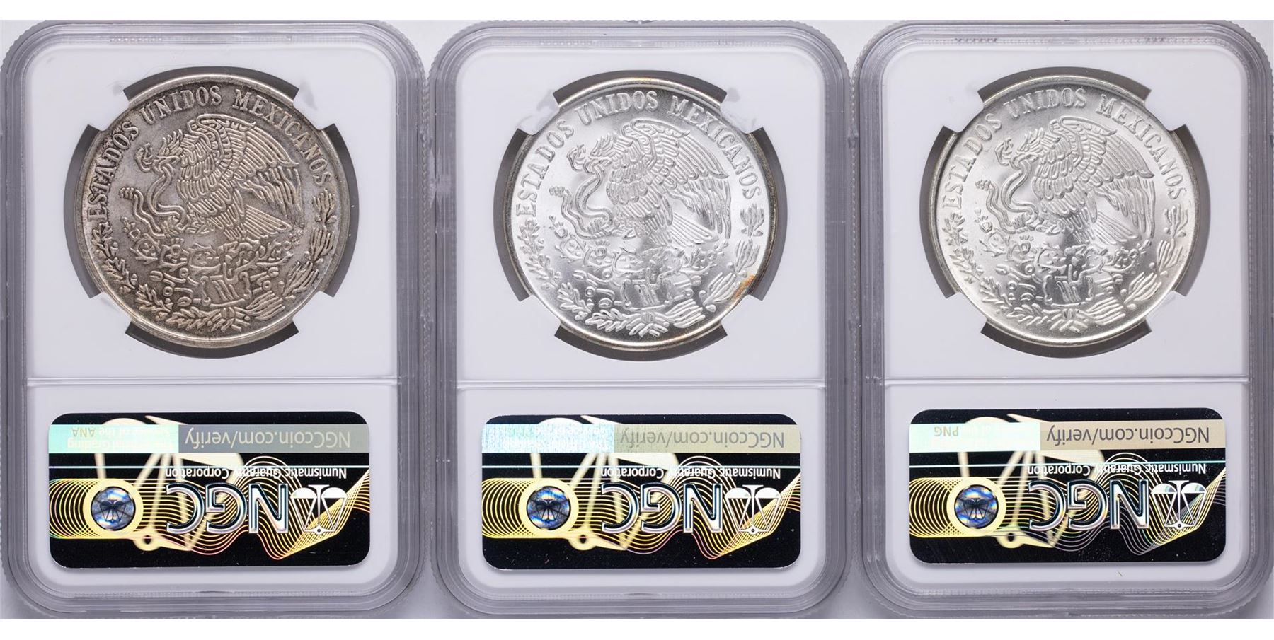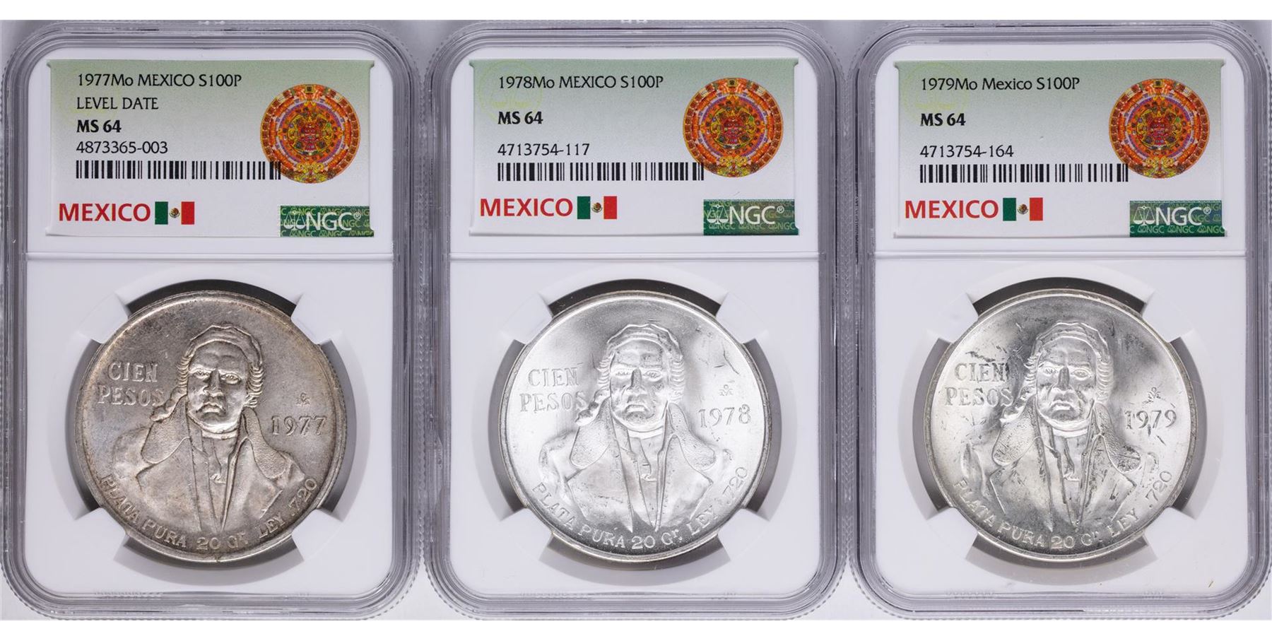 One Lot of 1977Mo-1979Mo Mexico 100 Pesos Silver Coins NGC MS64. NGC Certified.
