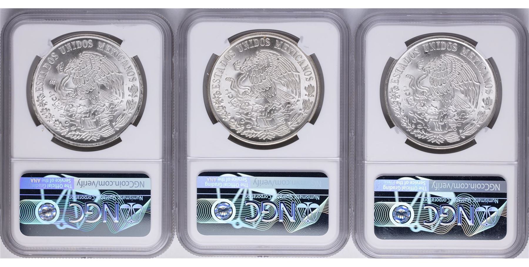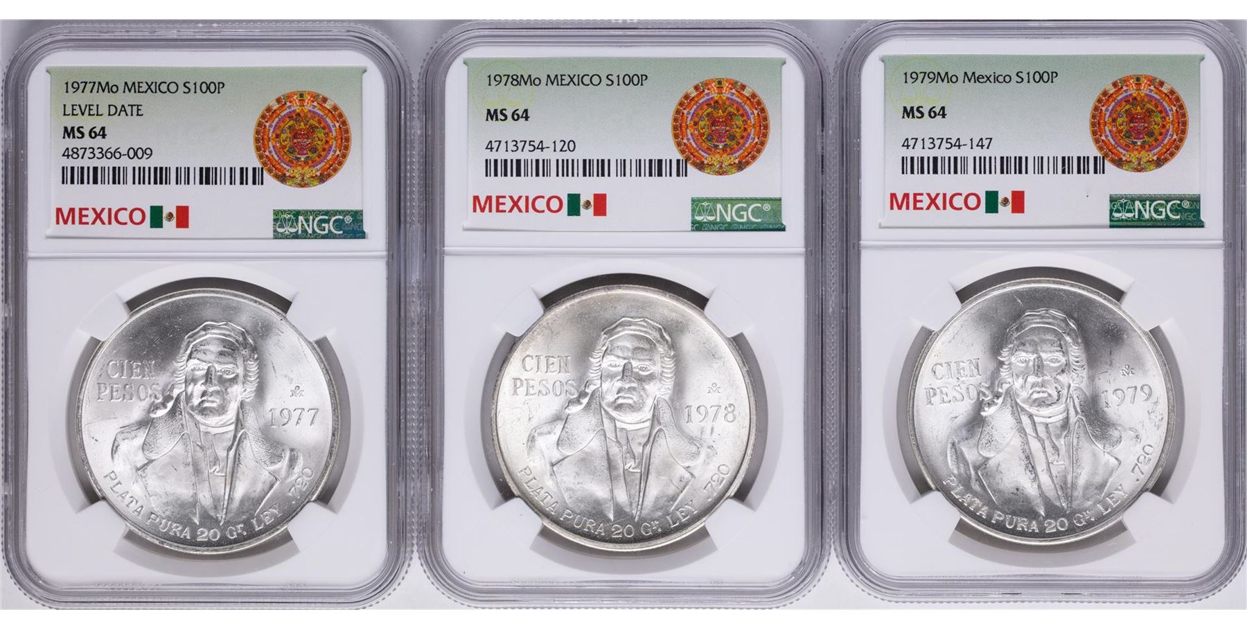 One Lot of 1977Mo-1979Mo Mexico 100 Pesos Silver Coins NGC MS64. NGC Certified.