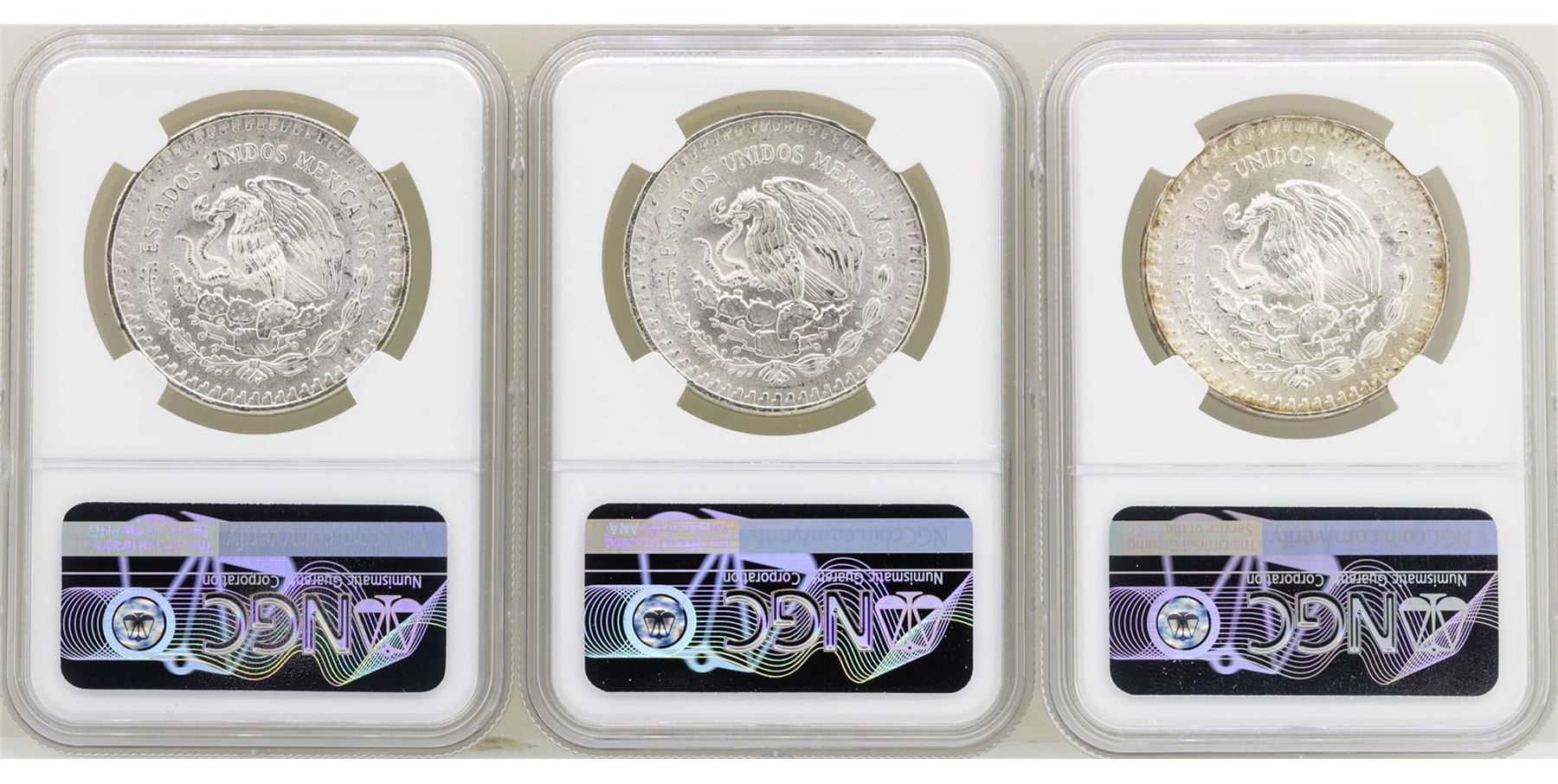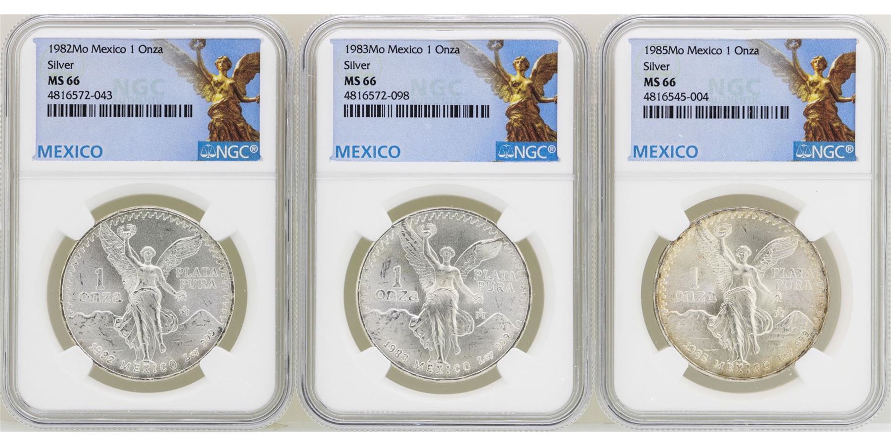 One Lot of 1982Mo/1983Mo/1985Mo Mexico Libertad Onza Silver Coins NGC MS66. NGC Certified.