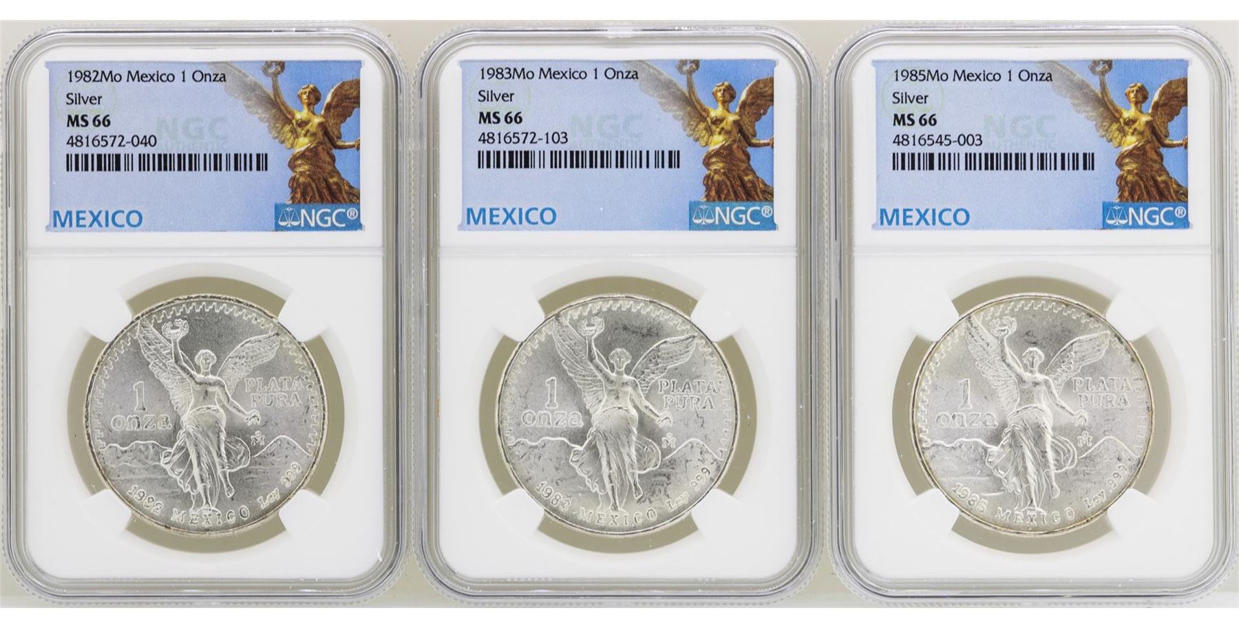 One Lot of 1982Mo/1983Mo/1985Mo Mexico Libertad Onza Silver Coins NGC MS66. NGC Certified.